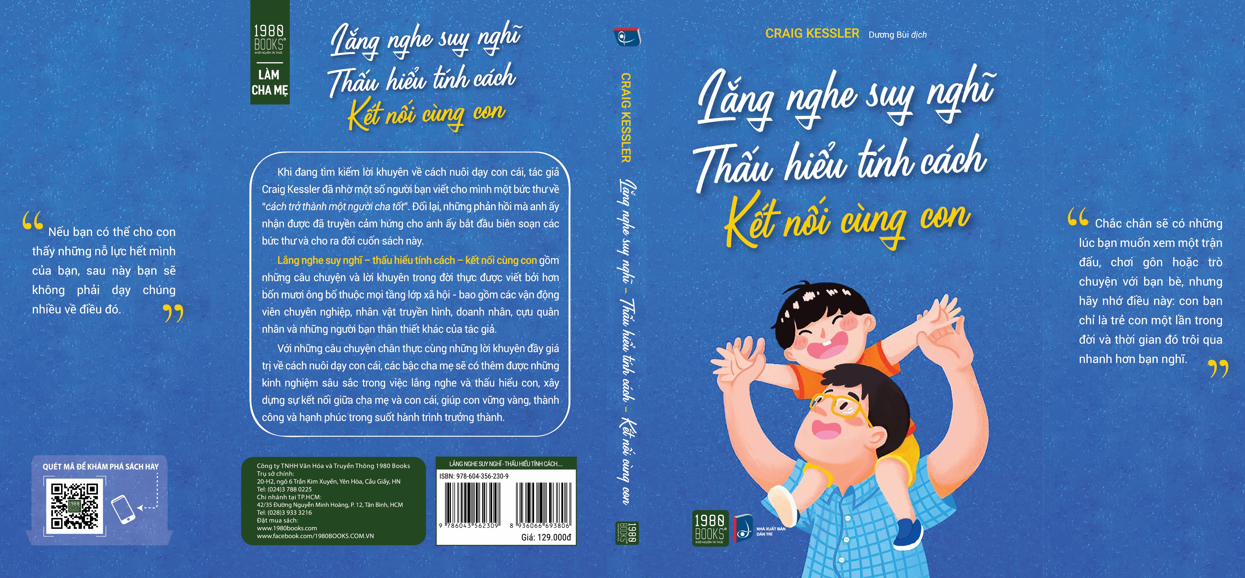 - Giúp con vững vàng, thành công và hạnh phúc trong suốt hành trình trưởng thành. Trong sách còn có những lời khuyên rất đắt giá, rất đáng chú ý mà quý vị phụ huynh nên đi sâu tìm hiểu để ứng dụng tốt nhất trong việc nuôi dạy con. Những lời khuyên đó là: • Khuyến khích con bạn và giúp chúng cảm thấy an toàn cả về thể chất và tâm lý. • Dành thời gian cho con bạn. Bóc trần câu nói cũ “chất lượng hơn số lượng” - nó không đúng. • Yêu vợ/chồng của bạn và chắc chắn rằng con bạn biết điều đó. Từ đó chỉ cho con bạn cách yêu thương cha mẹ, nuôi dưỡng tất cả các bài học và giá trị cuộc sống quan trọng. • Dẫn dắt bằng ví dụ: Trẻ chú ý đến những gì bạn làm, hơn là chú ý đến những gì bạn nói. • Kỷ luật là quan trọng: Trẻ em cần có ranh giới, và việc có một cách tiếp cận kỷ luật sẽ giúp thực thi các ranh giới. • Khuyến khích con bạn chấp nhận rủi ro và hỗ trợ chúng khi chúng thất bại. Điều này giúp trẻ tồn tại và phát triển ở thế giới bên ngoài. • Tôn giáo rất quan trọng, là “kim chỉ nam” giá trị trong cuộc sống của chúng ta. Tiếp xúc với tôn giáo là một trong những cách hiệu quả nhất để đưa các giá trị tích cực vào cuộc sống. “Lắng nghe suy nghĩ, thấu hiểu tính cách, kết nối cùng con” cũng giới thiệu cho bạn đọc một số mẹo, thủ thuật, ý tưởng rất chiến thuật độc đáo và hấp dẫn. Qua cuốn sách này, bạn sẽ hiểu được rằng, khi bạn gặp khó khăn với con cái, bạn luôn có thể nhận được nhiều lời khuyên từ những ông bố khác – giúp bạn trang bị nhiều công cụ hơn cho hành trình bên cạnh, nuôi dạy con lớn khôn; tuy sẽ gập ghềnh nhưng cũng đầy thú vị đấy nhé! THÔNG TIN TÁC GIẢ CRAIG KESSLER sinh ra và lớn lên ở San Diego. Anh theo học Đại học Georgetown trước khi bắt đầu sự nghiệp kinh doanh riêng trong lĩnh vực tư vấn. Sau khi kết hôn với bạn gái thời trung học, anh theo học Trường Kinh doanh Harvard. Vài năm sau khi tốt nghiệp, ở độ tuổi 31, anh ấy trở thành lãnh đạo một doanh nghiệp có tên Topgolf. Tại đây, anh ấy cộng tác với một đội ngũ chuyên gia tuyệt vời, họ cùng nhau biến Topgolf trở thành một trong những công ty giải trí - thể thao phát triển nhanh nhất thế giới.