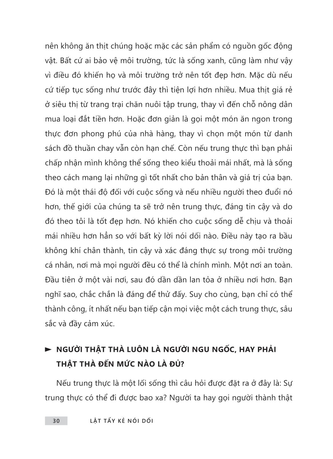 Dù bảo vệ sự thật không dễ dàng chút nào vì nói dối thuận tiện, dễ làm mẫu và mang lại lợi ích tức thời cho người nói, thì bạn vẫn nên hiểu rằng sự dối trá sẽ không giúp bạn đi xa. Cứ lạm dụng những lời nói dối vì ít để lại hậu quả thì về sau, dù bạn có nói thật cũng chẳng mấy ai tin. Đó là lý do chúng ta nên lựa chọn đứng về phía sự thật, LẬT TẨY KẺ NÓI DỐI, nhìn-thấu-điều-kẻ-khác-đang-che-giấu để biến môi trường xung quanh thành một nơi an toàn mà chúng ta được là chính m.ình.