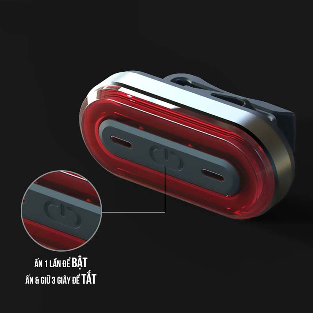 Mô tả sản phẩm Đèn 5 LED Cảnh báo sau Xe Đạp giúp đạp xe an toàn ban đêm 4 chế độ sáng Hướng Dẫn Sử dụng: Ấn & Giữ 3 giây để Bật hoặc