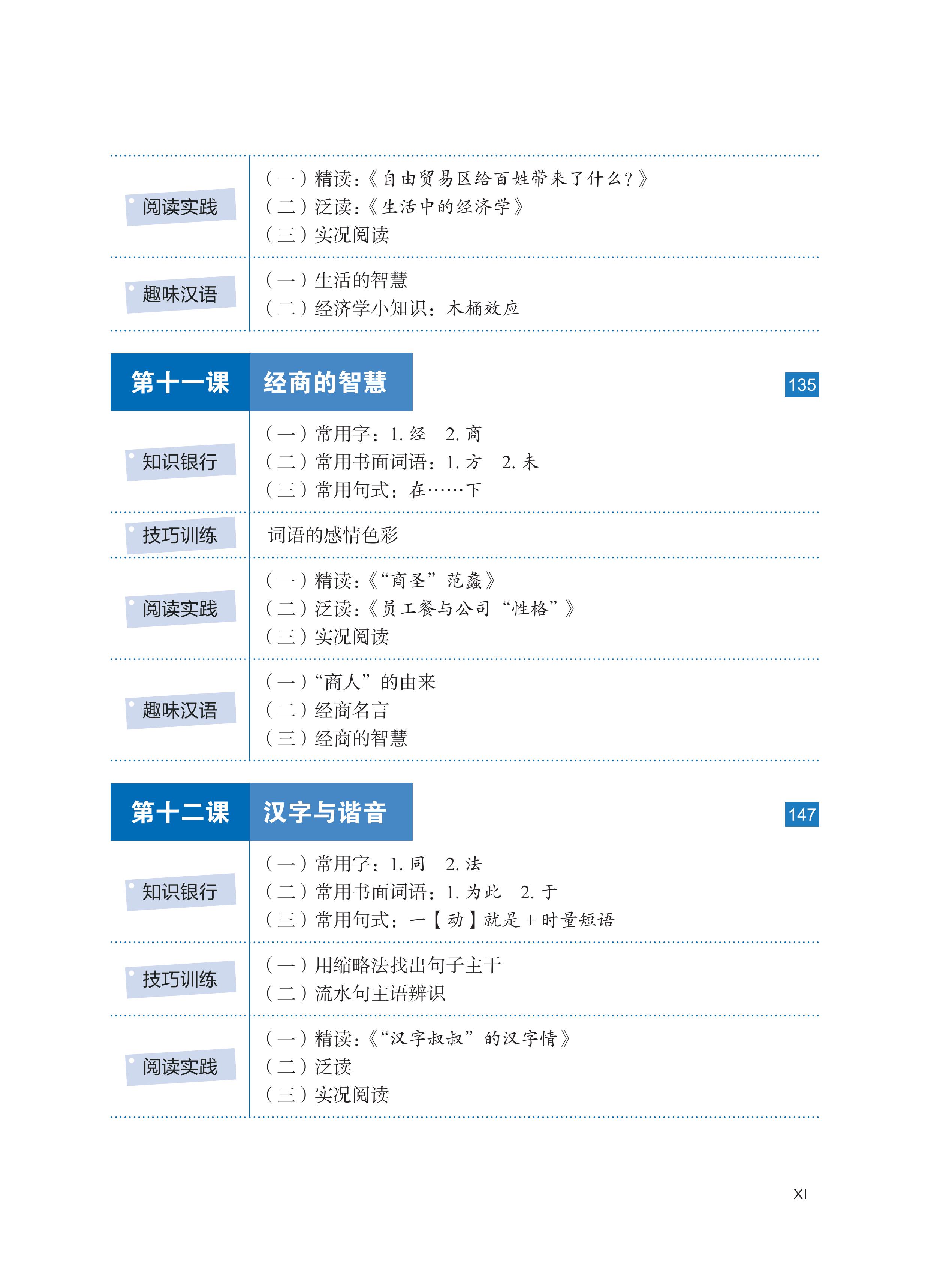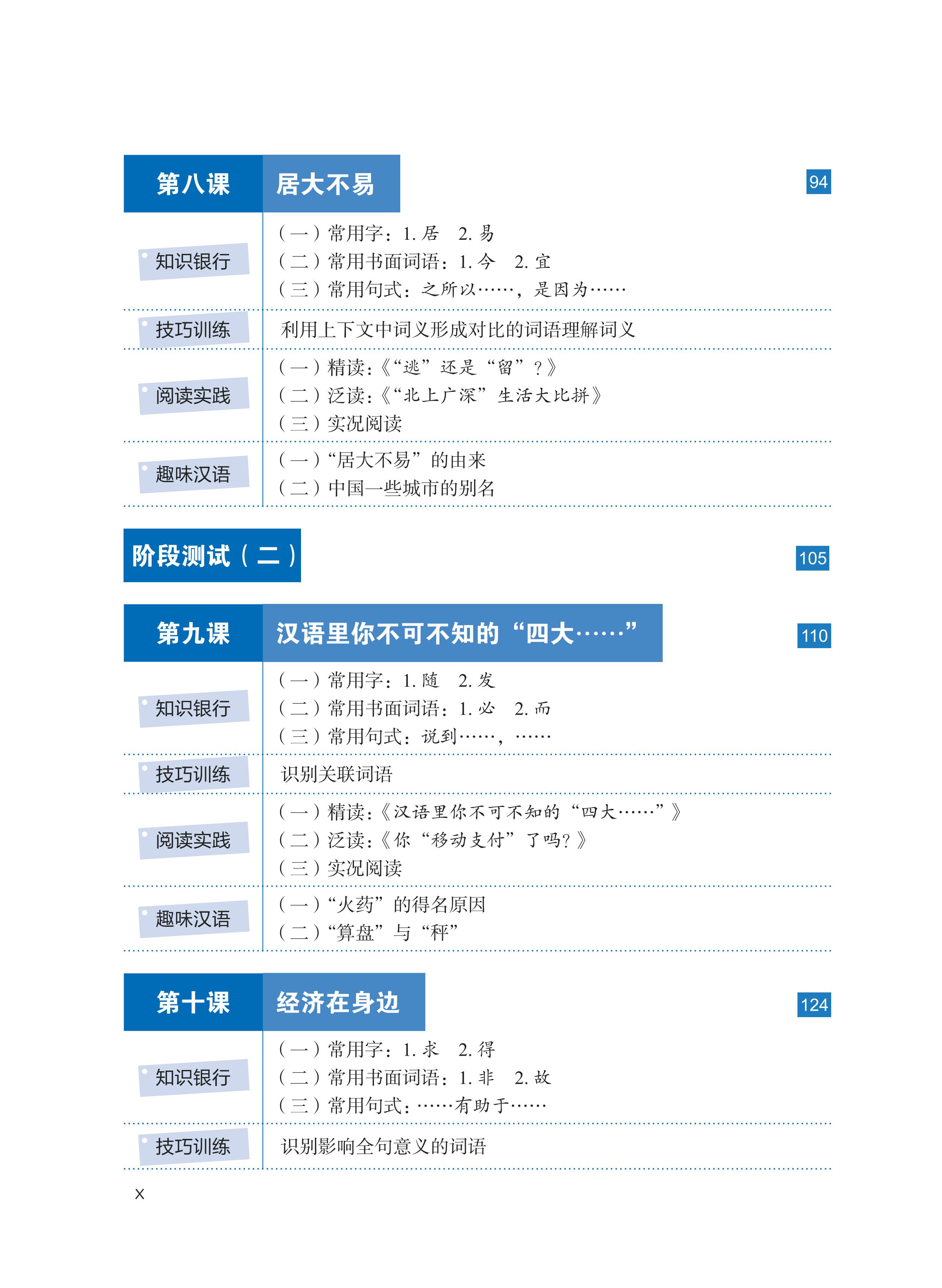 Phần 4: Hán ngữ thú vị. Bao gồm những tri thức thú vị, thục ngữ, ngữ lưu hành trên mạng, v.v., nhằm điều tiết cường độ và tiết tấu đọc, kết hợp giải trí với học tập.
