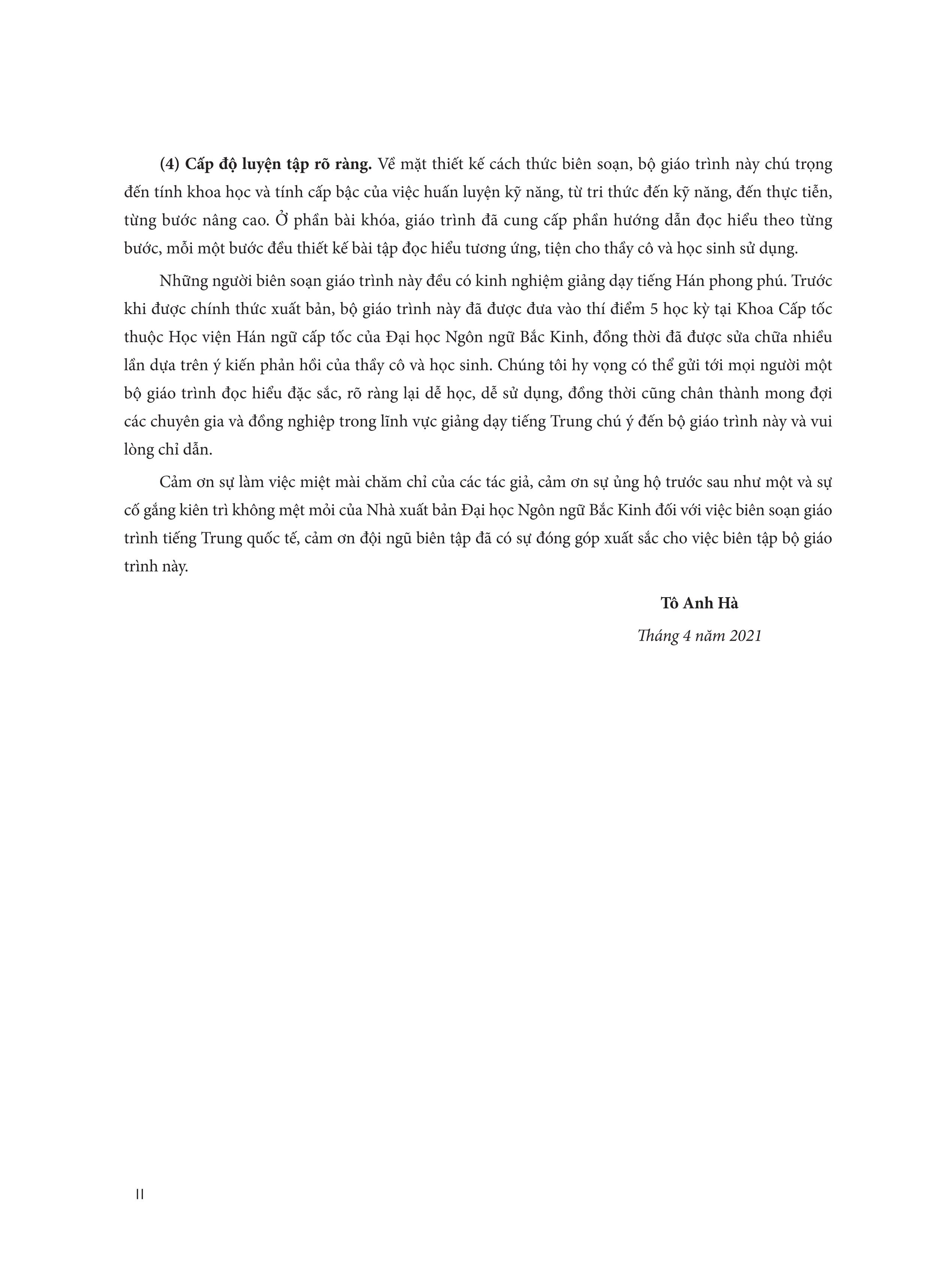 Những kiến nghị trên chỉ đưa ra để tham khảo, thầy cô có thể dựa theo các tình huống cụ thể như trình độ tiếng Trung của người học, việc sắp xếp chương trình học,… để điều chỉnh một cách linh hoạt việc sắp xếp, thiết kế trong giáo trình. Ở đây, chúng tôi xin chân thành đón nhận sự phê bình, góp ý của các chuyên gia, đồng nghiệp và người học tiếng Trung đối với quyển giáo trình này.