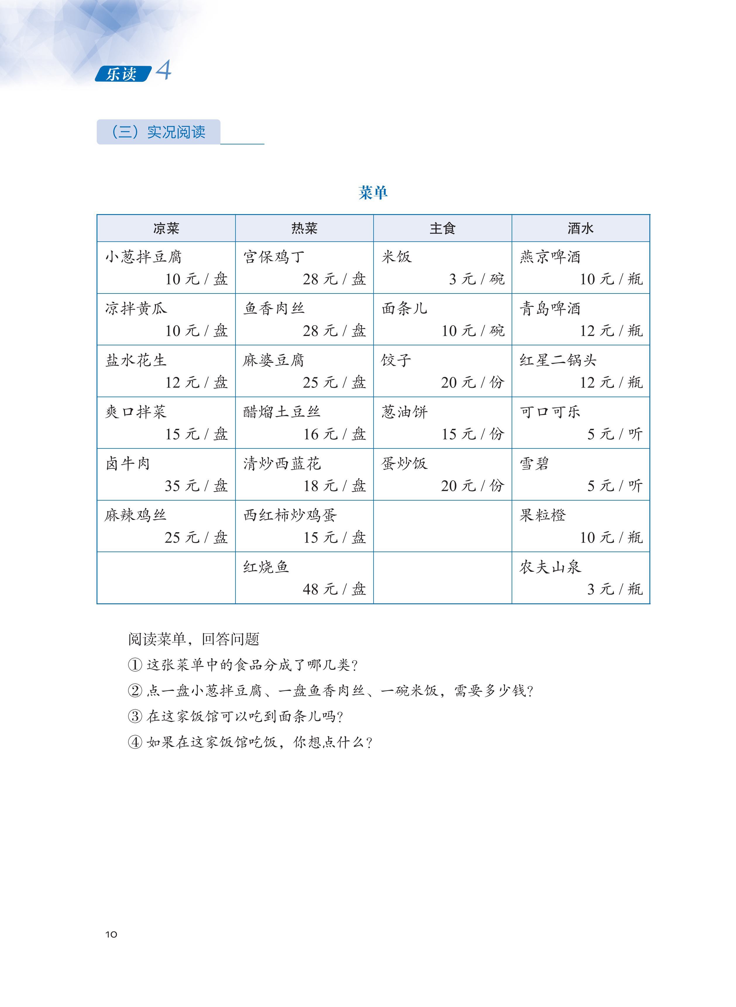 Phần 3: Thực tiễn đọc hiểu. Bao gồm ba phần lớn là đọc chuyên sâu, đọc mở rộng và đọc thực tế. Phần “Đọc chuyên sâu” và “Đọc mở rộng” bao gồm các nội dung như: học tập các từ vựng trọng tâm và từ vựng mở rộng thuộc các chủ đề thường gặp, bài tập khởi động, bài tập lý giải nội dung bài khóa, lý giải nghĩa câu và lý giải nghĩa từ, v.v., đồng thời trên cơ sở này hướng dẫn người học nắm được ý chính của bài khóa, vận dụng từ vựng trọng tâm thuộc chủ đề bài khóa để trình bày quan điểm, giới thiệu nội dung có liên quan một cách ngắn gọn. Phần “Đọc thực tế” bao gồm hai loại: Loại thứ nhất - “Đọc văn thuyết minh”, giúp người học tích lũy thường thức về lịch sử, văn hóa cần có đồng thời được tiếp xúc rộng rãi trong học tập và sinh hoạt thường ngày; loại thứ hai - “Tra tìm thông tin”, như tra tìm các thông tin du lịch, bảng giờ tàu xe, bảng các triều đại lịch sử, v.v., việc thiết kế nhiệm vụ nhấn mạnh tính ứng dụng, mục đích nhằm giúp người học giải quyết các vấn đề thường gặp trong học tập và sinh hoạt thường ngày.