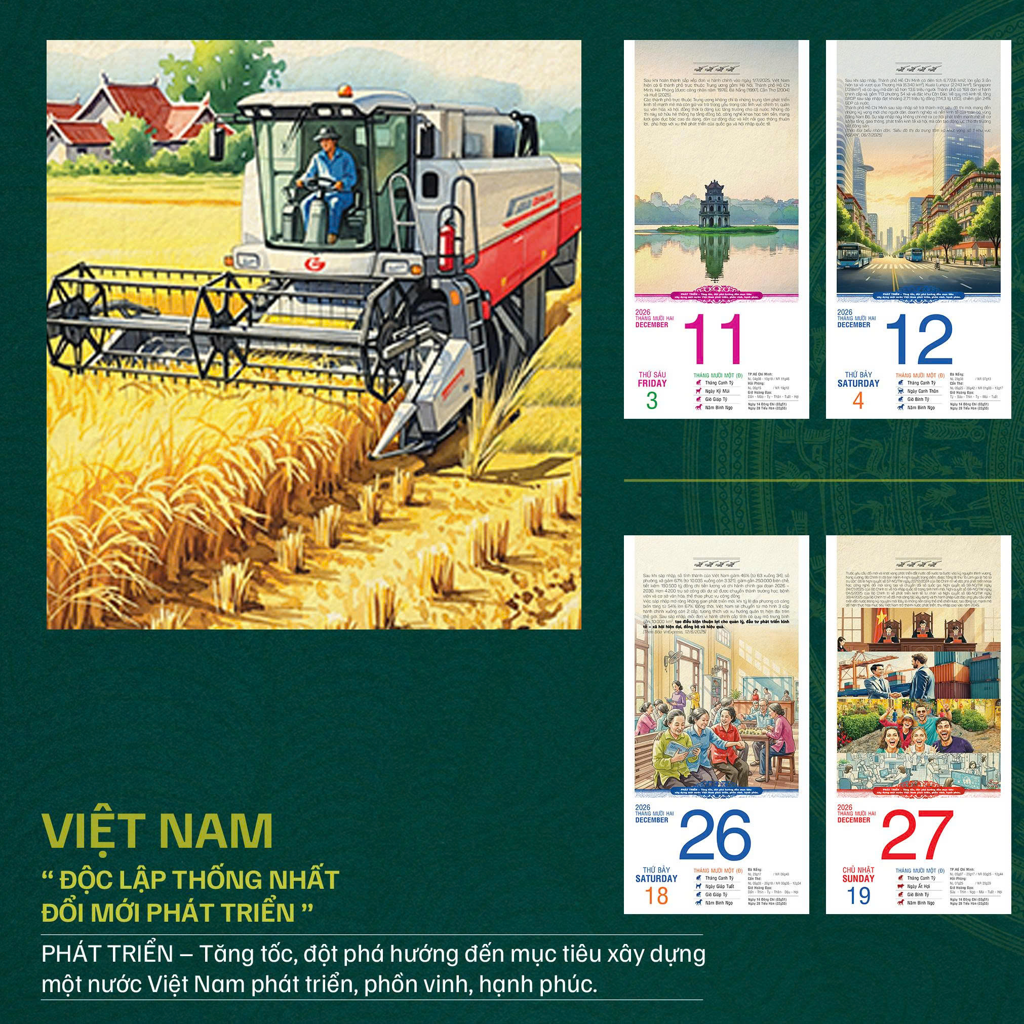 - PHÁT TRIỂN – Tăng tốc, đột phá hướng đến mục tiêu xây dựng một nước Việt Nam phát triển, phồn vinh, hạnh phúc. Khởi nguồn từ quá trình dựng nước của các vua Hùng, cuộc khởi nghĩa oanh liệt của Hai Bà Trưng, trải các triều đại Đinh, Lê, Lý, Trần, Nguyễn cho đến ngày nay, lịch sử Việt Nam là bản anh hùng ca bất tận về tinh thần yêu nước, ý chí độc lập và khát vọng tự do mãnh liệt. Tinh thần ấy được kết tinh trong ba áng hùng văn bất hủ: "Nam quốc sơn hà", "Bình Ngô đại cáo", và "Tuyên ngôn Độc lập" – Những bản tuyên ngôn thiêng liêng khẳng định nền độc lập, khí phách ngàn đời của dân tộc Việt. Trải qua chiến tranh, chia cắt, rồi hòa bình lập lại, Việt Nam bước vào công cuộc Đổi mới với tinh thần dấn thân và khát vọng vươn lên. Từ một đất nước nghèo nàn, lạc hậu, Việt Nam từng bước chuyển mình, đạt mức thu nhập trung bình cao và đang hướng đến mục tiêu trở thành quốc gia phát triển có thu nhập cao vào năm 2045. Mỗi trang lịch là một lát cắt lịch sử sống động, được thể hiện sinh động qua những bức tranh đa sắc độ – kết quả lao động sáng tạo của nhóm họa sĩ. Quá trình minh họa công phu dựa trên việc tham khảo nhiều nguồn tài liệu: sách vở, hình ảnh tư liệu, báo chí, phim ảnh và cả gợi ý từ công nghệ trí tuệ nhân tạo (AI), nhằm mang đến một sản phẩm lịch vừa sâu sắc về nội dung, vừa giàu tính nghệ thuật. Chúng tôi kỳ vọng bộ lịch này sẽ được đón nhận tích cực từ các cơ quan Đảng, Nhà nước, các doanh nghiệp, cùng cộng đồng người Việt trong và ngoài nước. Đồng thời, đây cũng là tài liệu hữu ích dành cho nhà trường, giúp các em học sinh – sinh viên hiểu biết lịch sử, nuôi dưỡng lòng tự hào, tình yêu quê hương đất nước và khát vọng xây dựng tương lai.Với tất cả tâm huyết và trách nhiệm, những người thực hiện mong rằng bộ lịch không chỉ đơn thuần là công cụ ghi ngày tháng, mà còn là cầu nối ký ức – tri thức – cảm hứng cho mỗi người Việt trên hành trình hội nhập và phát triển. Trân trọng giới thiệu.