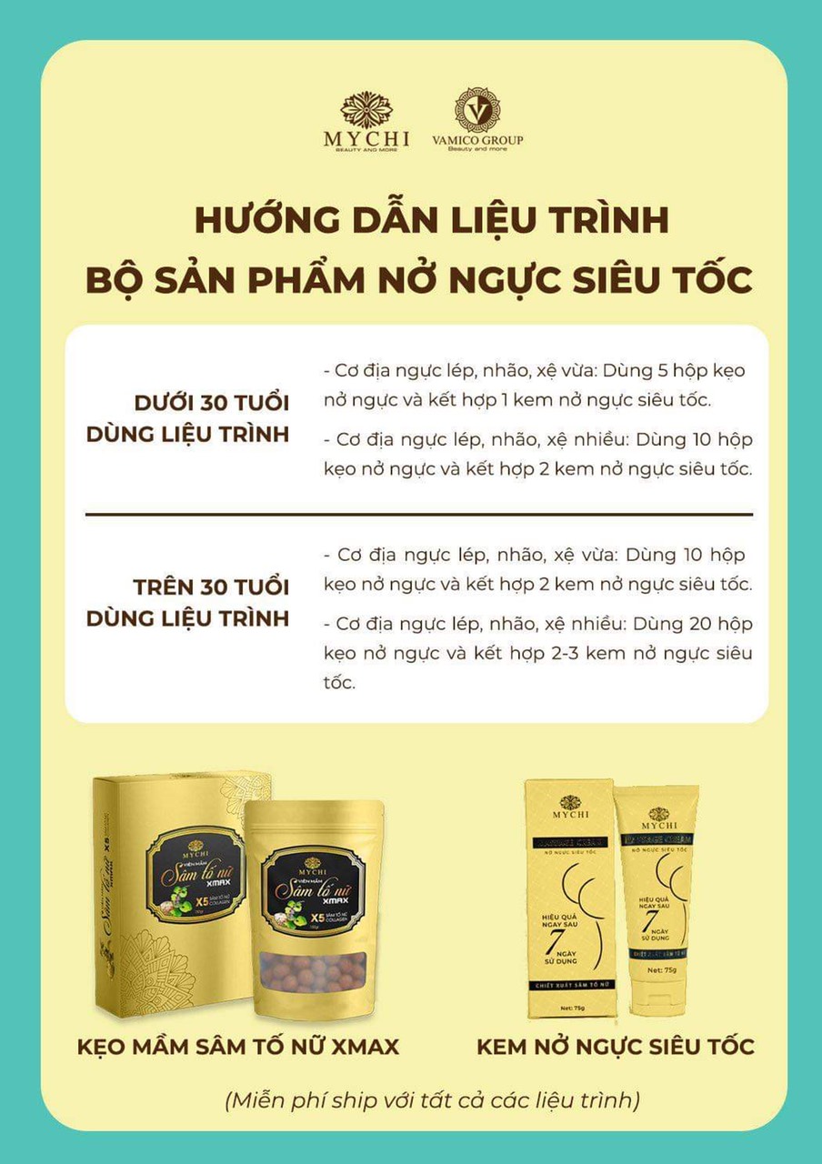 - CÁCH SỬ DỤNG a. Kem nở ngực siêu tốc Bước 1: Rửa sạch vòng 1 và các vùng da xung quanh bằng nước ấm, dùng khăn mềm thấm nước lau khô; Bước 2: Dùng một lượng kem vừa đủ bôi lên vùng da đã vệ sinh sạch sẽ; Bước 3: Massage ngực phải trong vòng 5- 10 phút, lặp lại 2 lần như vậy để đảm bảo kem thấm đều trên da. Làm tương tự đối với ngực bên trái và đợi đến khi kem khô hoàn toàn; Bước 4: Khi kem đã khô thì bạn tiếp tục thực hiện động tác massage như trên cả 2 bên ngực. Thực hiện động tác massage theo hình kim đồng hồ hoặc hình xoắn ốc; Duy trì thực hiện 2 lần/ ngày mỗi buổi sáng thức dậy và trước khi đi ngủ để thu được hiệu quả tốt nhất. b. kẹo mầm sâm tố nữ xmax Mychi