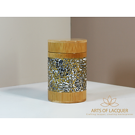 Sản phẩm trong hình là "Lọ Tre Sơn Mài Khảm Trai Xanh Biển" từ Arts of Lacquer. Hộp có thiết kế tròn với nền màu vàng nhạt, được trang trí bằng hoa văn tinh xảo