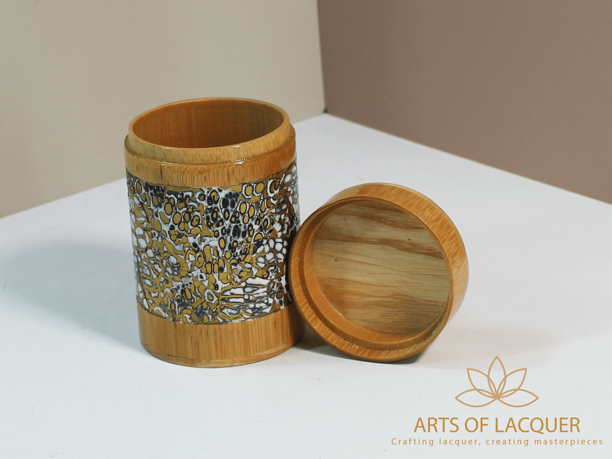Sản phẩm trong hình là "Lọ Tre Sơn Mài Khảm Trai Họa Tiết Trắng Đen" từ Arts of Lacquer. Hộp có thiết kế tròn với nền màu vàng nhạt và vảy đen, được trang trí