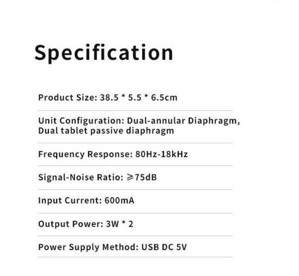 Công suất : 3W x 2 Tần số đáp ứng: 20Hz – 20KHz Tỷ số nén nhiễu S/N: 58dB Trở kháng: 4Ω Distortion: 80Hz-20KHz ≤ 1% Cổng kết nối : Jack 3.5mm và USB Nút