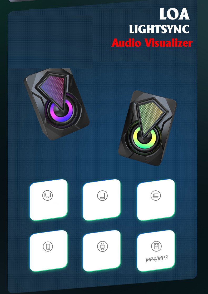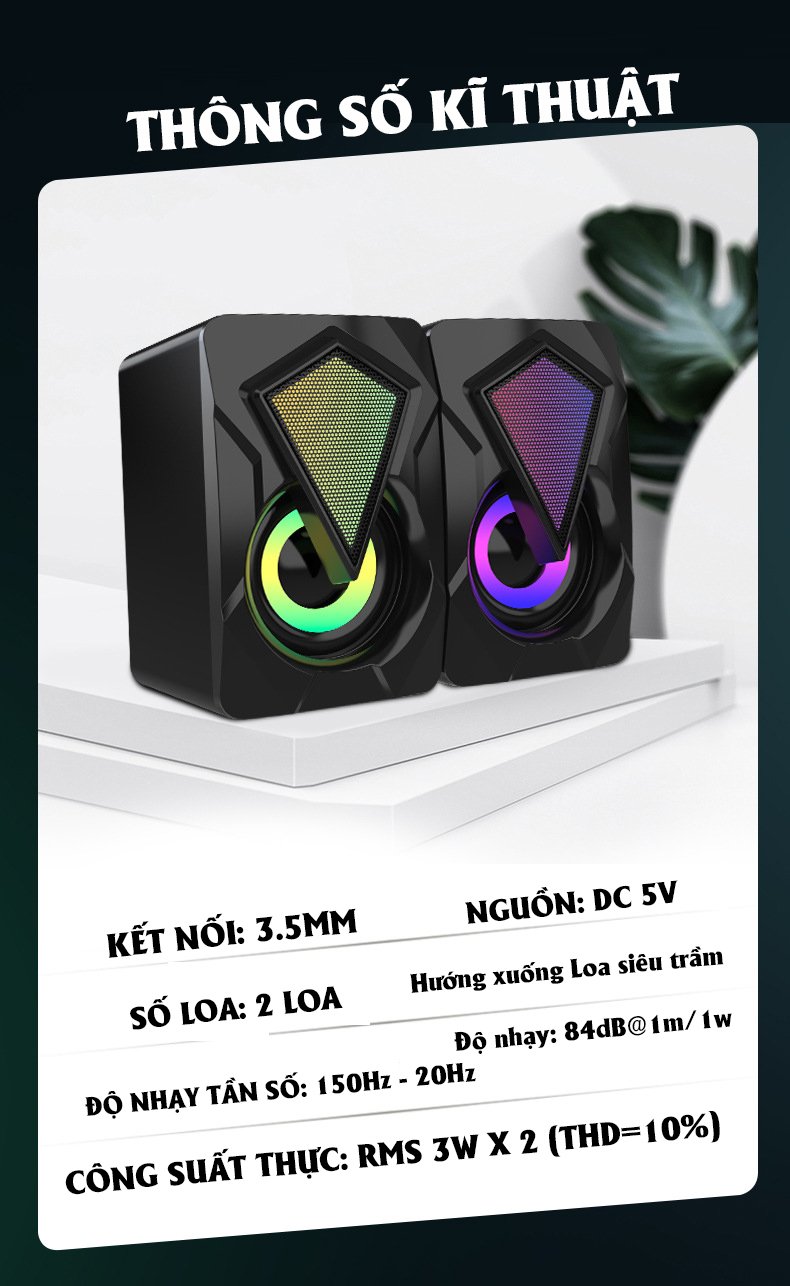 Đặc điểm nổi bật: - Bộ đôi loa stereo với chất âm khá trong phân khúc - Đèn LED 7 màu hiện đại làm điểm nhấn cho không gian làm việc - Sử dụng nguồn