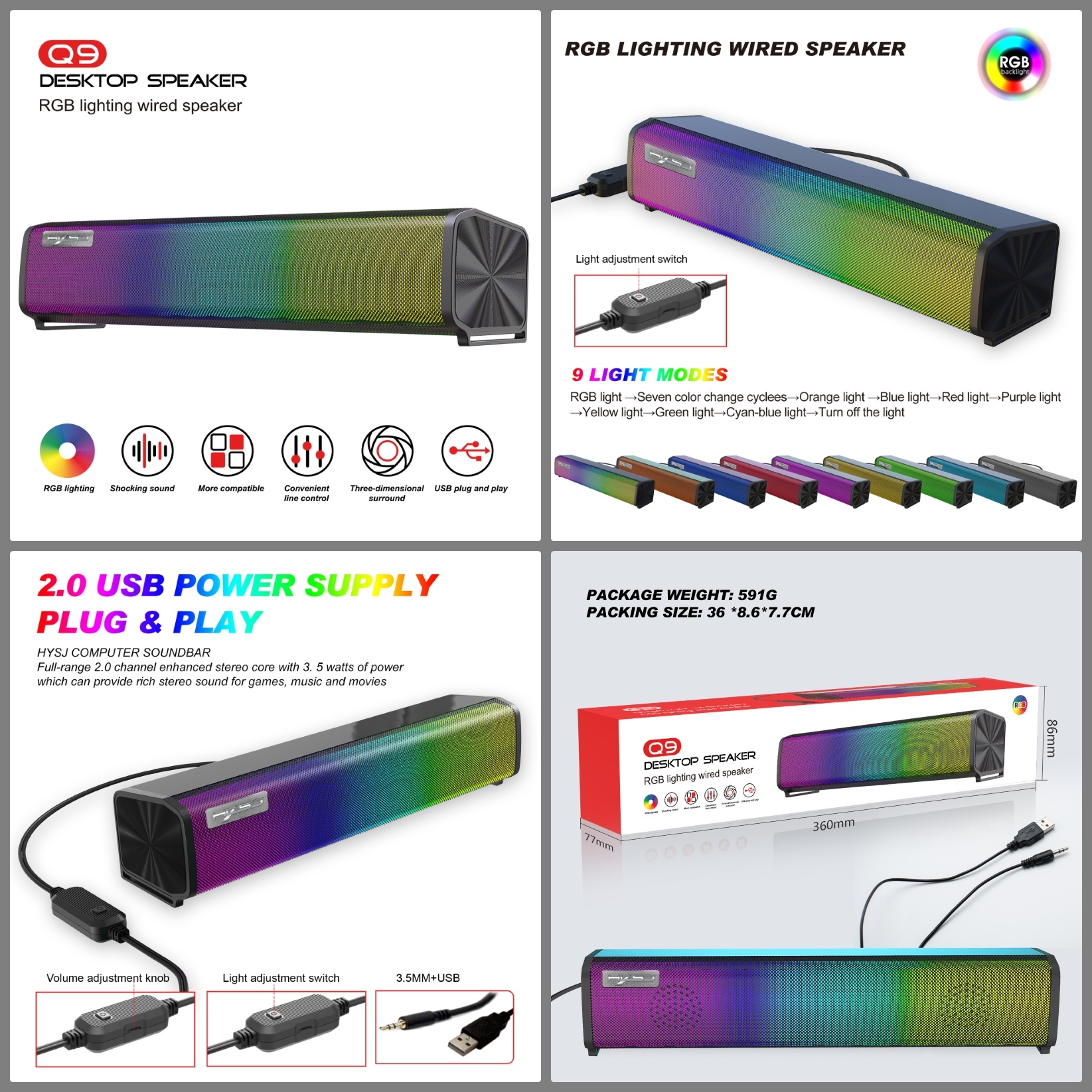 ✨Loa vi tính Q9 Sound Bar HD Led RGB cho máy tính, laptop, điện thoại, máy tính bảng hàng nhập khẩu