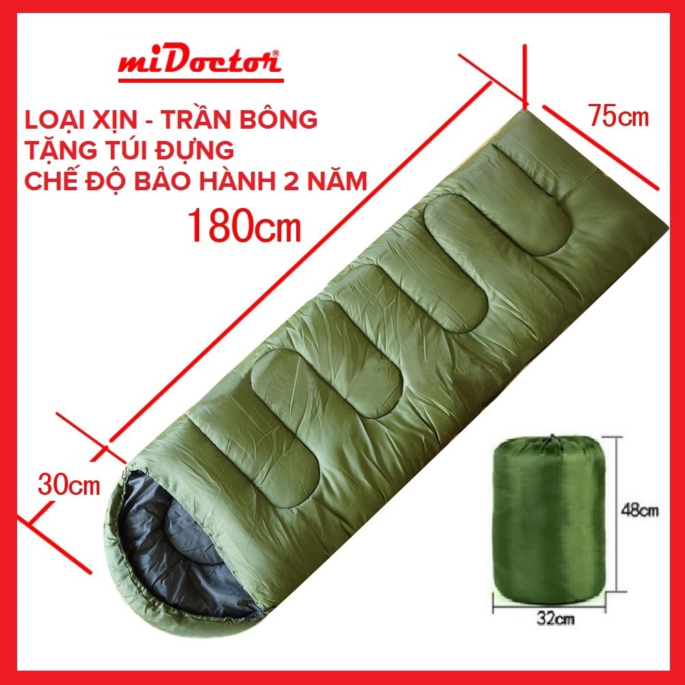 Túi ngủ văn phòng trần bông cao cấp Túi ngủ du lịch phượt có trùm đầu Chính hãng Kích thước 210cm x 75cm Trọng lượng: 1 kg Chất liệu: Vải tổng hợp Polyester 190T sợi