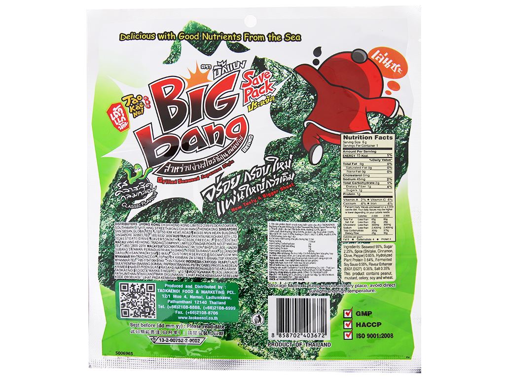 Rong Biển Taokaenoi Big Bang Vị Truyền Thống được làm từ rong biển tươi ngon, tốt cho sức khỏe. Sản phẩm sử dụng phương pháp sấy chân không nên rong biển vẫn giữ được đặc