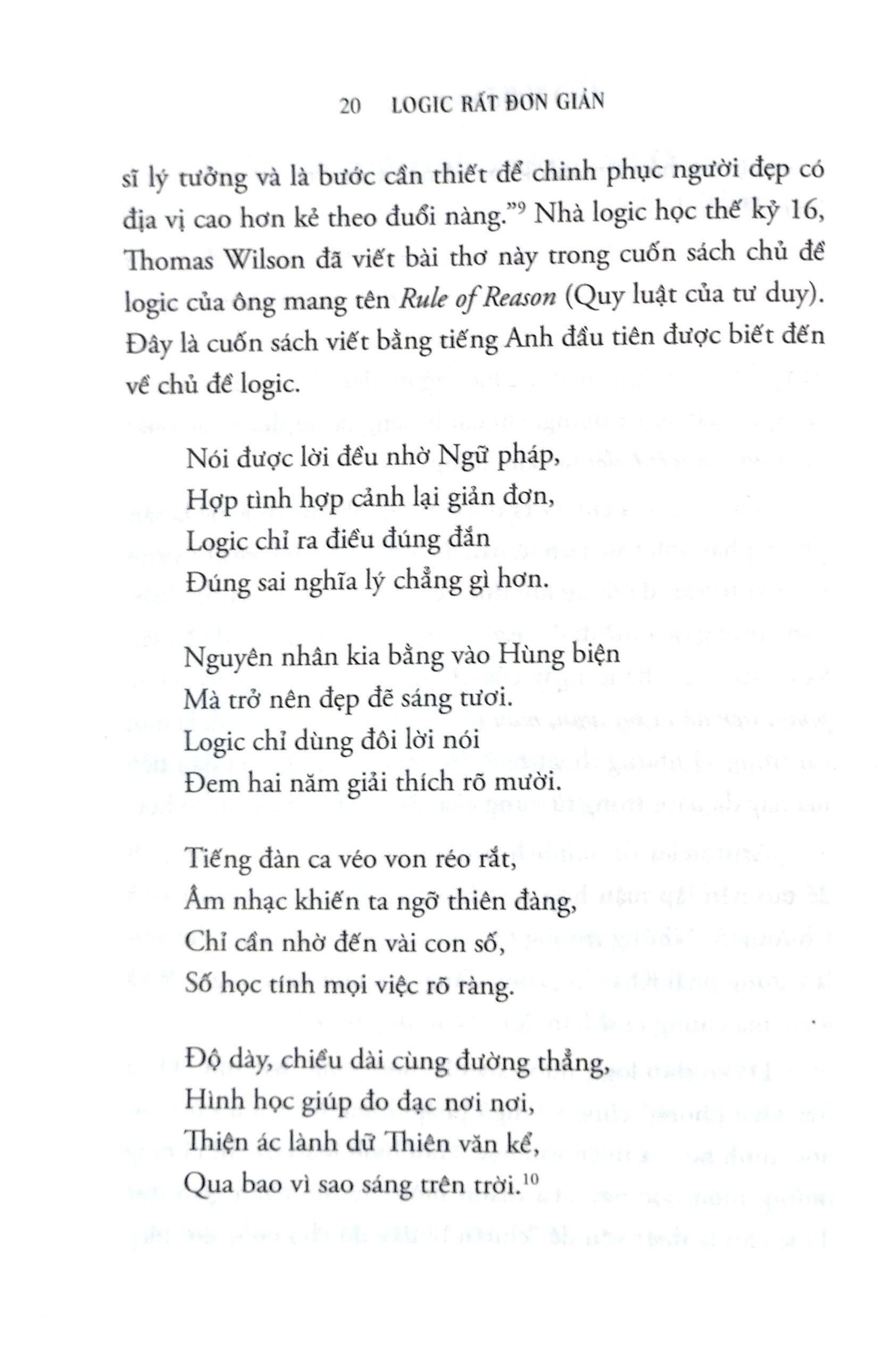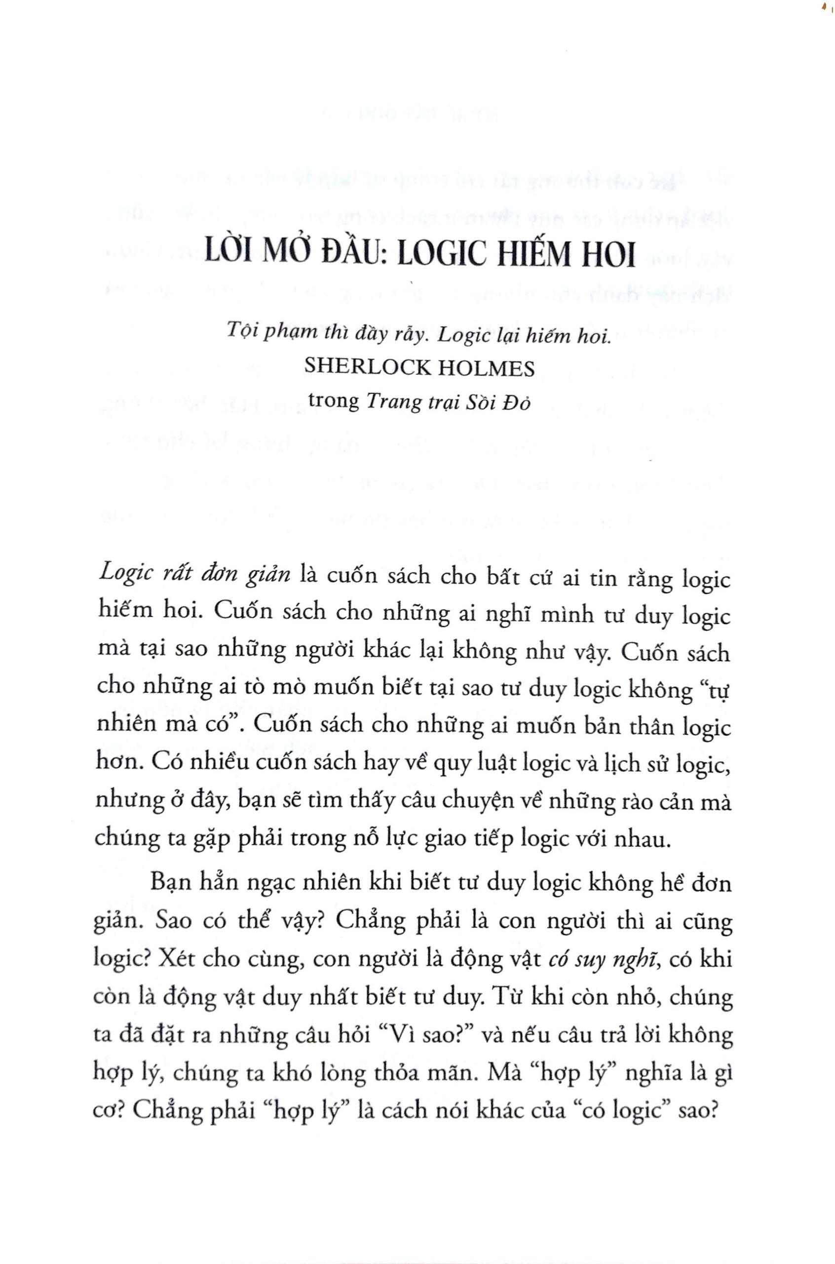 - Nếu một người mẹ nói với con: “Nếu ăn hết cơm, con có thể được ăn tráng miệng” thì có thực sự là trẻ phải ăn hết cơm thì mới được ăn tráng miệng? Đánh giá của chuyên gia, tổ chức uy tín về cuốn sách cùng các giải thưởng: “Đọc văn của Bennett… giống như một cuộc trò chuyện bên tách cà phê của những người trí thức sành sỏi… không gì có thể gợi mở và khiến độc giả hứng thú hơn.” – SIMON INGS, NEW SCIENTIST “Trong trường hợp này, bạn có thể đánh giá một cuốn sách qua bìa sách – hay chí ít là nhan đề: tác giả đã đưa ra lời hứa ở ngay từ đầu và thực hiện nó bằng cách khiến logic thật dễ hiểu đối với bạn đọc.” – MANYA CHYLINSKI, LIBRARY JOURNAL Trích đoạn hay : Tật khó tưởng tượng nếu các suy luận trong đời sống hằng ngày lại không dựa trên tư duy logic. Bác sĩ, cũng như thợ sửa ô tô, phải tư duy dựa trên các triệu chứng m.ình thấy. Cảnh sát điều tra và chuyên gia pháp y phải xử lý và tư duy logic từ các manh mối. Người dùng máy tính phải làm quen với các quy tắc logic mà máy móc được thiết kế để tuân theo. Các quyết định kinh doanh dựa trên phân tích logic tình hình thực tế và những bất ngờ có thể xảy ra. Về tác giả: Deborah J. Bennett dạy môn toán tại Đại học New Jersey City ở Jersey City, New Jersey được mệnh danh là “người giỏi xuất sắc” với trong biến các vấn đề trừu tượng trở nên “dễ hiểu và ấn tượng”. Trong cuốn sách này, tất cả lý thuyết, lịch sử và giai thoại đều được trình bày theo lối dễ hiểu và hài hước nhất. Logic rất đơn giản thực sự là cuốn sách hiếm hoi giúp bạn hiểu tường tận về tư duy logic.