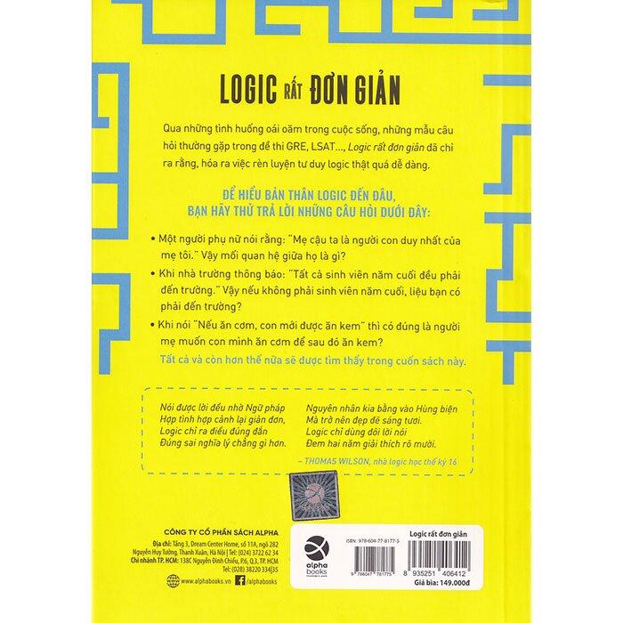 Mua tại TiktokLogic Rất Đơn Giản Qua những tình huống khó khăn cần xử trí trong cuộc sống, những câu hỏi giúp bạn cải thiện điểm thi trong bài GRE, LSAT…, Logic rất đơn giản đã chỉ ra rằng, logic hóa ra không phải là điều bất khả. Cuốn sách này không giống những cuốn sách khác về logic. Ở đây, bạn sẽ hiểu được tại sao tư duy logic lại không hề dễ dàng. Nếu bạn nghĩ m.ình khá logic thì hãy thử một vài câu đố logic mà những người khác thấy khó nhằn. Kể cả nếu bản thân bạn không mắc bẫy tư duy, cuốn sách này cũng sẽ giúp bạn hiểu những khó khăn mà người khác gặp phải. BẠN LOGIC ĐẾN ĐÂU? BẠN CÓ THỂ TRẢ LỜI NHỮNG CÂU HỎI SAU?