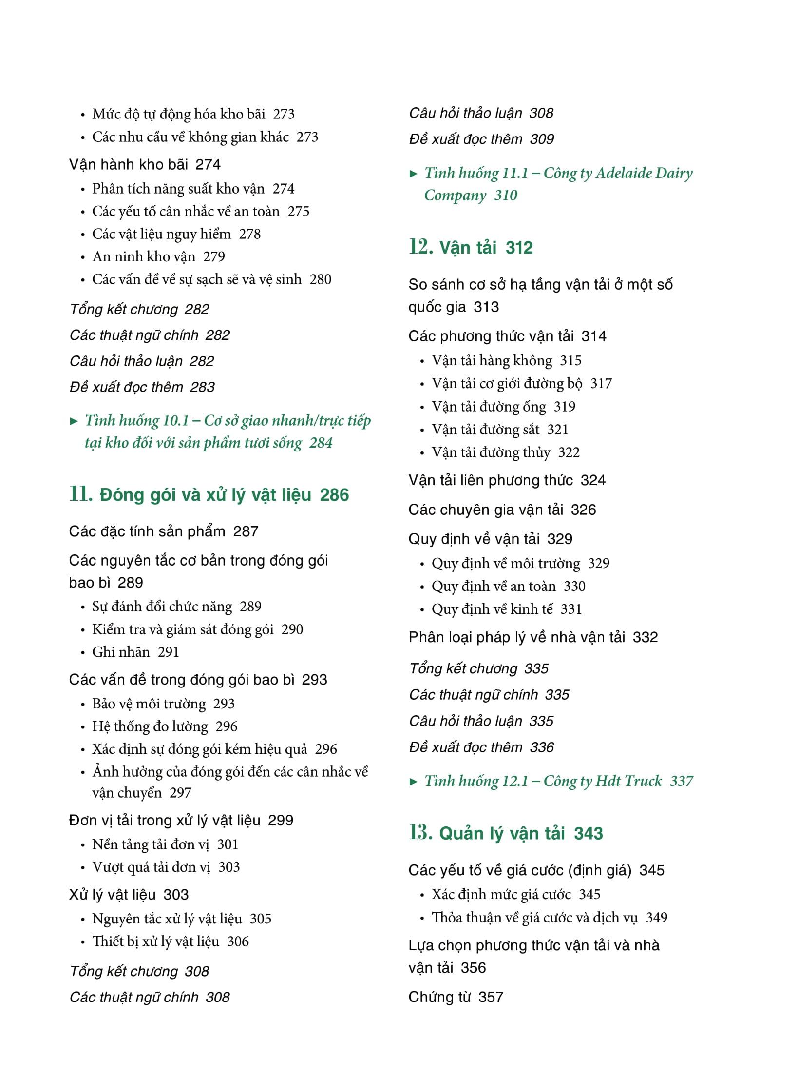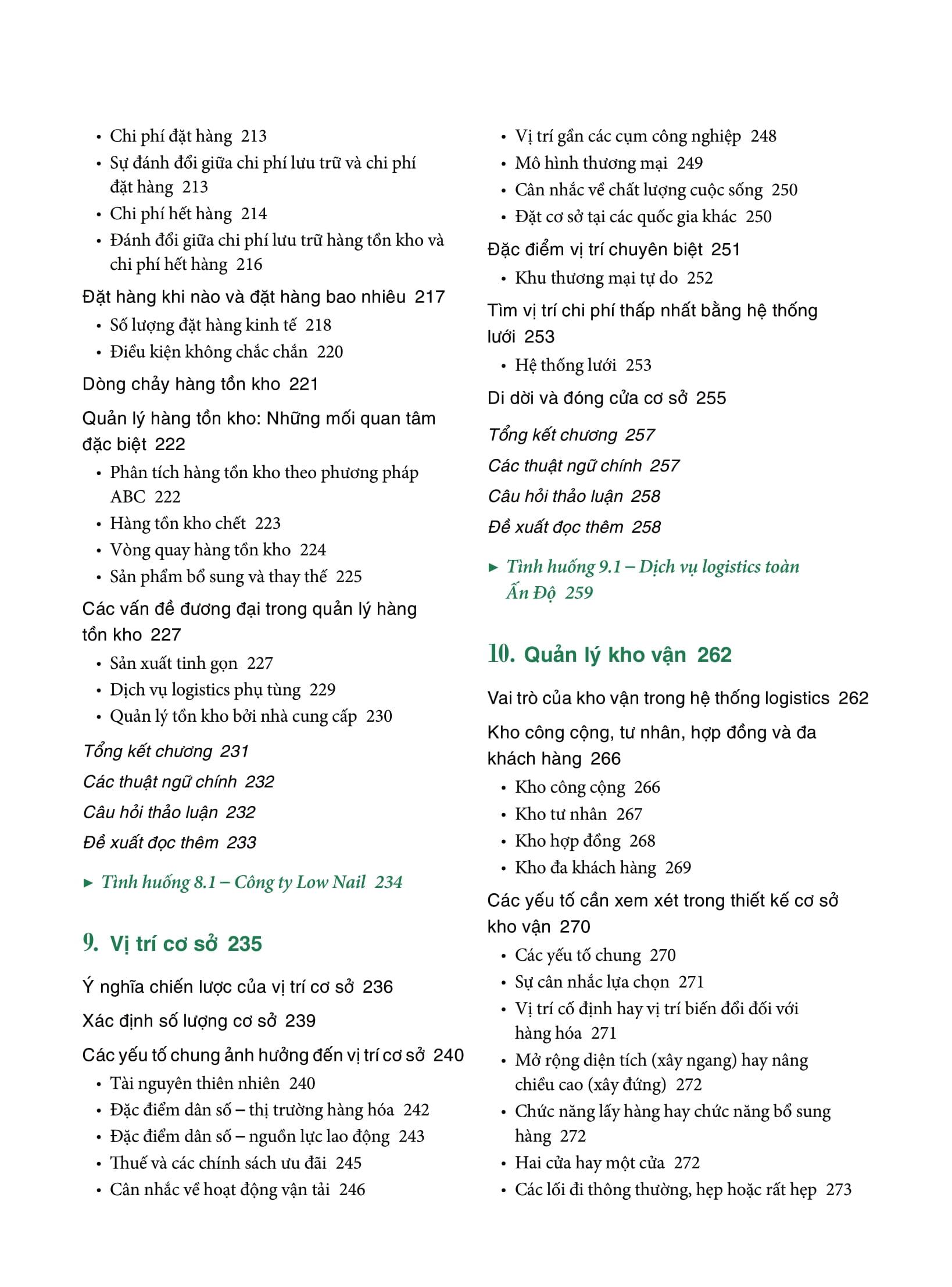 Logistics và Quản trị chuỗi cung ứng là một cuốn “bách khoa toàn thư” mang đến những kiến thức, hướng dẫn đầy đủ nhất về Logistics và quản trị chuỗi cung ứng đương đại. Điều đó sẽ mang đến cho độc giả những thông tin và kiến thức chính xác, bổ ích nhưng vẫn vô cùng dễ dàng tiếp thu, giúp độc giả dễ dàng hơn trong việc tìm hiểu và nghiên cứu về ngành nghề “mắt xích phát triển kinh tế” này. Quyển textbook này sẽ giúp bạn nắm rõ từ kho vận đến giao nhận một cách dễ dàng với 3 phần chính: Tổng quan về Logistics, Quản trị chuỗi cung ứng và Các thành tố của hệ thống Logistics. Mỗi phần sẽ tiếp tục chia ra thành các mục nhỏ, bảo đảm sẽ giúp bạn hiểu tường tận từng ngõ ngách của Logistics và quản trị chuỗi cung ứng.