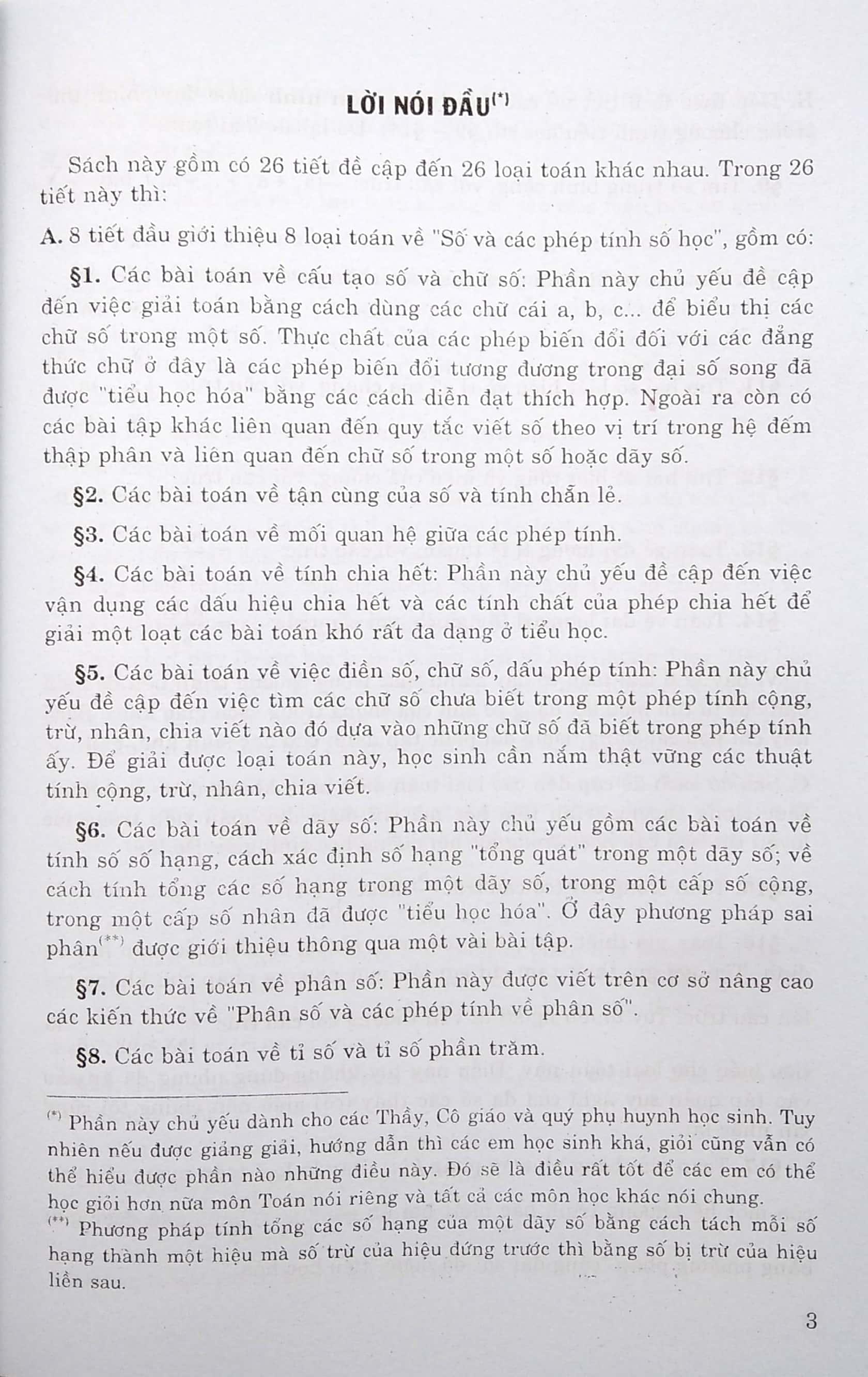 Mua tại TiktokSách này gồm 26 tiết đề cập đến 26 loại toán khác nhau. Đối với mỗi bài toán, bạn nên đọc thật kĩ đề, tìm hiểu cặn kẽ những đặc điểm của bài toán rồi tự mình suy nghĩ, cố hắng tìm ra lời giải, cố gắng tìm được nhiều cách giải và lựa chọn trong đó cách giải nào hay nhất. Sau đó mới tìm xem lời giải của bài toán mà sách đã nêu. Đa số các bài toán ở sách này đều là toán khó, trong đó có nhiều bài được rút ra từ các kì thi học sinh giỏi toán bậc tiểu học toàn quốc và các tỉnh, thành phố trong cả nước.