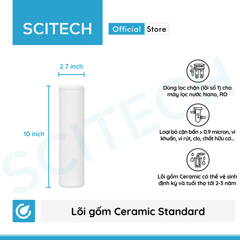 ✨Lõi Gốm Ceramic Standard 10 inch by Scitech - Lõi số 1 máy lọc nước Nano/UF/RO (Dùng thay thế lõi PP) - Hàng chính hãng