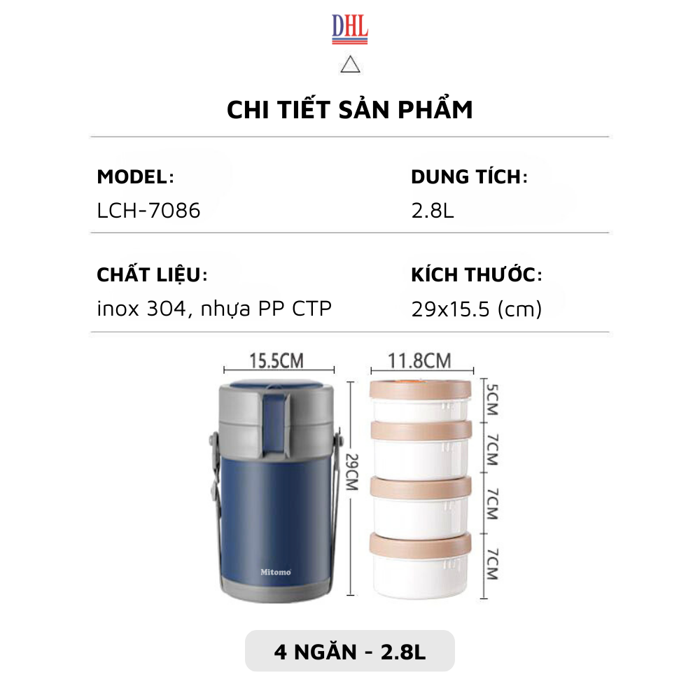 ✨Lồng cơm 4 ngăn giữ nhiệt văn phòng Mitomo LCH-7086 dung tích 2.8L kèm nĩa và thìa