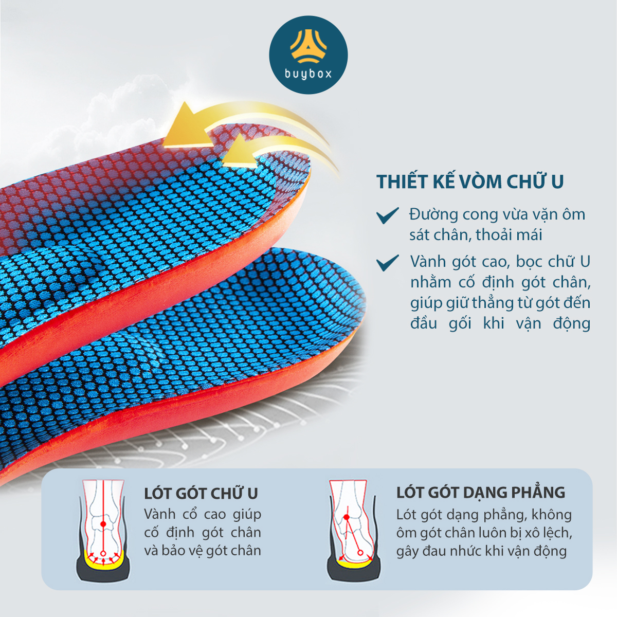 Lót giày thiết kế bọc chữ U ôm chân, cố định gót chân, giúp giữ thẳng từ gót đến đầu gối khi vận động