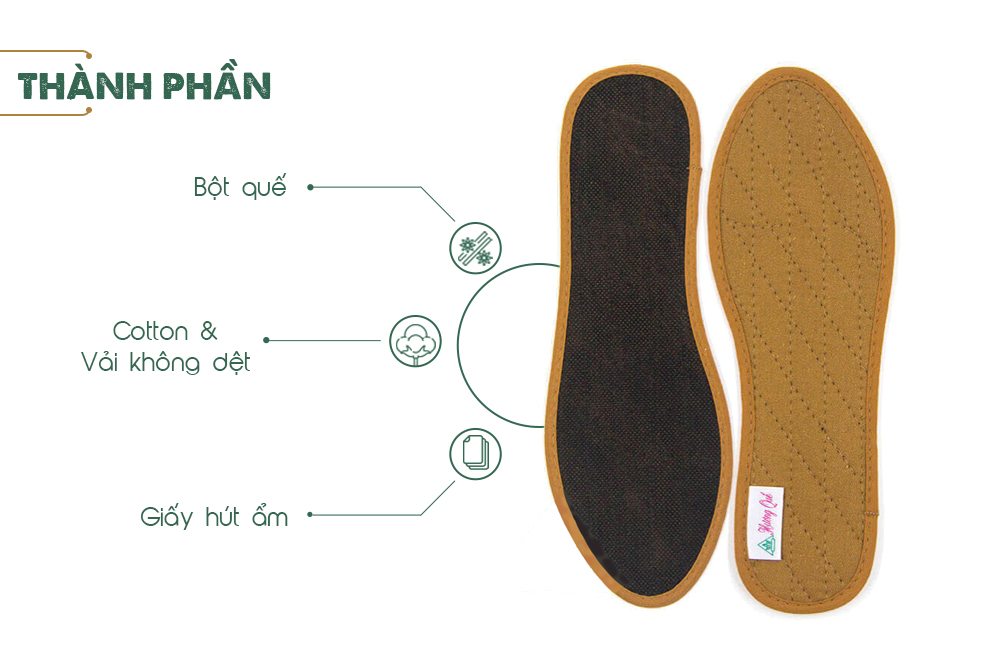 Chất liệu sản phẩm lót giày – Vải 100% cotton – Bột quế tự nhiên nguyên chất 100% – Giấy hút ẩm – Vải không dệt màu đen – Viền xung quanh bằng vải cotton