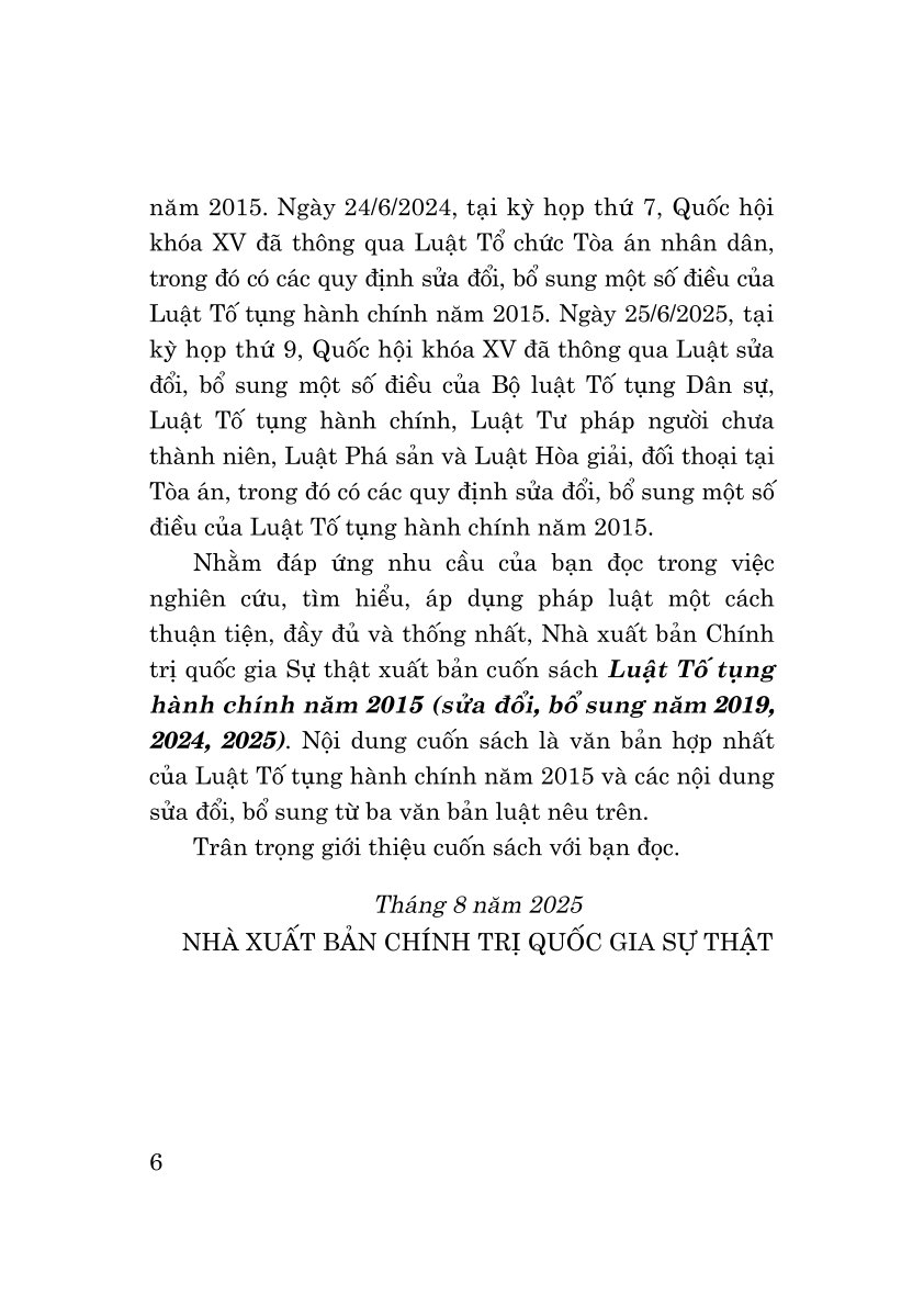 Mua tại TiktokNhằm đáp ứng nhu cầu của bạn đọc trong việc nghiên cứu, tìm hiểu, áp dụng pháp luật một cách thuận tiện, đầy đủ và thống nhất, Nhà xuất bản Chính trị quốc gia Sự thật xuất bản cuốn sách Luật Tố tụng hành chính năm 2015 (sửa đổi, bổ sung năm 2019, 2024, 2025). Nội dung cuốn sách là văn bản hợp nhất của Luật Tố tụng hành chính năm 2015 và các nội dung sửa đổi, bổ sung từ ba văn bản luật nêu trên.