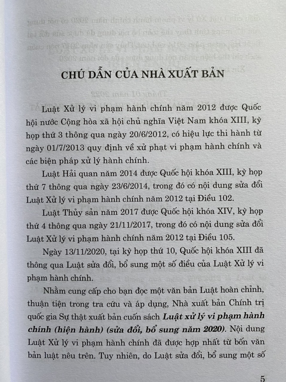 Mua tại TiktokVăn bản Luật xử lý vi phạm hành chính (hiện hành) (sửa đổi, bổ sung năm 2020) gồm 6 phần và 142 điều, quy định về xử phạt vi phạm hành chính và các biện pháp xử lý hành chính. Luật này được nhất thể hóa từ bốn văn bản luật: Luật Xử lý vi phạm hành chính năm 2012; Luật Hải quan năm 2014; Luật Thủy sản năm 2017; Luật sửa đổi, bổ sung một số điều của Luật Xử lý vi phạm hành chính. Tuy nhiên, do Luật sửa đổi, bổ sung một số điều của Luật Xử lý vi phạm hành chính năm 2020 có nội dung mang tính thay thế toàn bộ nội dung đã được sửa đổi tại Luật Hải quan năm 2014 và Luật Thủy sản năm 2017 nên cuốn sách chỉ thể hiện phần nội dung được sửa đổi năm 2020