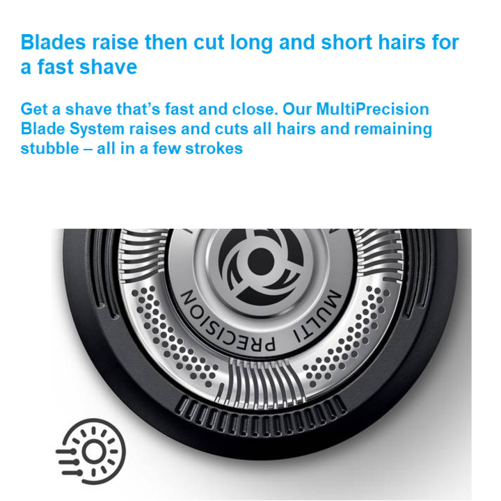 • Cạo sát mà không cắt xước vào da. Hệ thống lưỡi cạo Super Lift & Cut Action của chúng tôi có các đầu cạo được thiết kế lượn tròn trượt êm ái trên khuôn mặt và bảo vệ làn da.
