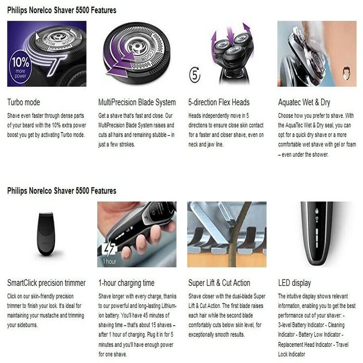 • Chọn cách cạo râu bạn thích. Với đầu bịt Khô & Ướt Aquatec, bạn có thể chọn cạo khô nhanh và thoải mái. Hoặc bạn có thể cạo ướt với kem cạo râu hay bọt cạo râu, kể cả khi tắm.  Cạo qua những phần râu rậm rạp với sức mạnh nhiều hơn 10% - Cạo nhanh hơn qua những phần râu rậm rạp với khả năng tăng thêm 10% sức mạnh khi kích hoạt chế độ Turbo. Đầu cạo linh hoạt theo 5 hướng để cạo nhanh và sát
