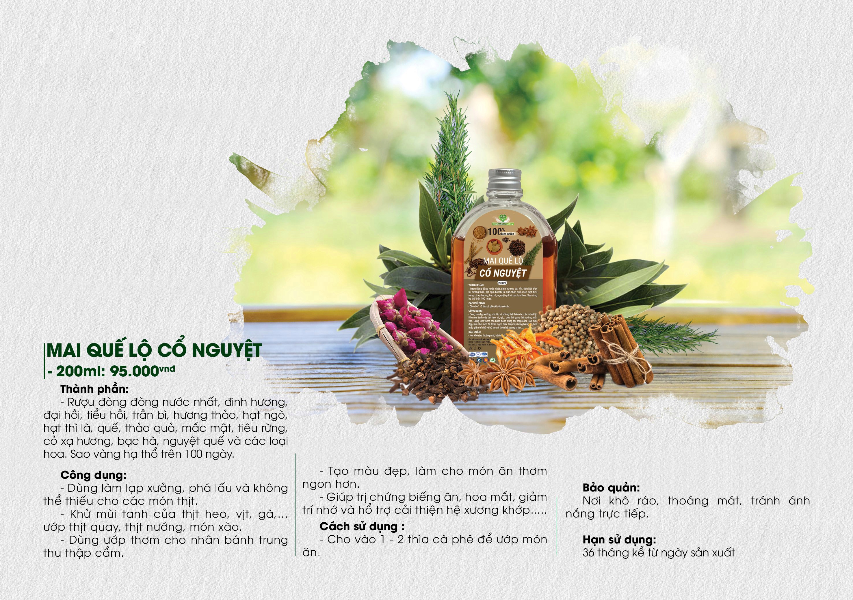 CÔNG DỤNG CỦA MAI QUẾ LỘ   – Thịt quay: Khi ướp các món thịt quay (gà quay, vịt quay, sườn bò, sườn heo ..) nếu có thêm vào muỗng Mai quế lộ sẽ giúp thịt quay thơm ngon, dậy mùi hơn.   – Lạp xưởng, xúc xích: lạp xưởng muốn ngon thì không thể thiếu mùi thơm Mai Quế Lộ.   – Nhân thập cẩm bánh nướng (bánh trung thu), bí quyết làm bánh nướng thập cẩm thơm ngon là nhờ mùi Mai quế lộ.   – Phá lấu hay ướp bất cứ loại thịt gì cho món nướng mà thêm vài muỗng Mai Quế Lộ món ăn cũng dậy mùi hấp dẫn hơn, ngoài ra còn có công dụng khử mùi tanh của thịt rừng.   – Khi làm món trứng muối, nếu lăn vỏ trứng qua Mai Quế Lộ rồi lăn muối thì trứng sẽ có mùi thơm ngon hơn là khi chỉ lăn qua các loại thường và muối…   – Ngoài ra, Mai Quế Lộ này còn có tác dụng giúp khử các mùi hôi tanh của thực phẩm, đặc biệt là các món lòng, ruột…   —> Bạn không nên để thiếu thứ gia vị tưởng đơn giản nhưng lại vô cùng quan trọng cho món ăn này.   HÃY DÙNG THỬ VÀ CẢM NHẬN SỰ THƠM NGON KHÁC BIỆT CỦA MAI QUẾ LỘ MẸ KEN NHÉ!!!    LƯU Ý QUAN TRỌNG: Các bà nội trợ không có kiến thức đông y thì không nên tự ý ngâm Mai quế lộ để dùng, vì:   – Thứ 1: Nếu không biết cách chọn mua nguyên liệu chuẩn, các bạn có thể mua phải các vị thuốc bị nấm mốc sau đó được người bán khử nấm mốc bằng hóa chất, nếu ngâm phải những loại này sẽ rất độc hại cho sức khỏe.   Hoặc có thể bạn mua phải XÁC GIA VỊ (là những loại gia vị đã bị lấy gần hết tinh dầu thơm rồi, ngâm sẽ gần như không có mùi thơm, hoặc mùi rất nhạt, đặc biệt là quế, hồi và đinh hương là những vị hay bị lấy tinh dầu, nhiều khi người bán cũng không biết là mình đang bán “xác gia vị” đâu nên các bạn cũng đừng chửi họ nhé).   – Thứ 2: Các thành phần cần có tỷ lệ ngâm tương thích, ví dụ như quế là một trong những nguyên liệu không thể thiếu trong Rượu mai quế lộ, nhưng nếu cho tỷ lệ không chuẩn thì có thể làm người ăn bị cao huyết áp. Tương tự đinh hương cũng vậy, nếu dùng không đúng tỷ lệ thì cũng không có tác dụng, dùng nhiều sẽ tạo vị đắng, làm mất mùi thức ăn….   Bên cạnh đó, cùng 1 tên nguyên liệu như quế thì cũng có nhiều loại mà đôi khi người bán cũng không biết mình đang bán quế gì (quế có 2 loại là quế chi và quế thân).   MAI QUẾ LỘ MẸ KEN CÓ GÌ ĐẶC BIỆT? Mai quế lộ MẸ KEN ngâm trên 6 tháng, theo tỷ lệ chuẩn mai quế lộ ở được công ty nấu trực tiếp từ đòng đòng lúa non hữu cơ quê ngoại trồng, lấy những giọt tinh tuý nước đầu tầm 52 độ nguội.   Ngâm trong chum sành hạ thổ để khử andehit trên 100 ngày với 15 loại dược liệu quý như đinh hương, đại hồi, tiểu hồi, trần bì, hương thảo, hạt ngò, hạt thì là, quế, thảo quả, mắc mật, tiêu rừng, cỏ xạ hương, bạc hà, nguyệt quế, các loại hoa.   Mekenhouse