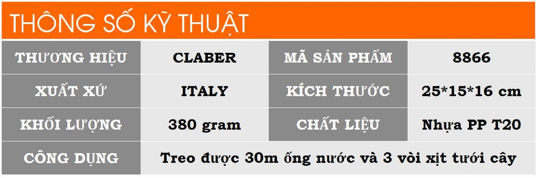 Thông tin cơ bản về độ chuyển ren ngoài Claber: - Thương hiệu: Claber - Sản xuất tại Italy - Chất liệu: nhựa ABS được đúc - Kích thước: Chiều rộng: 15 cm, Chiều cao: