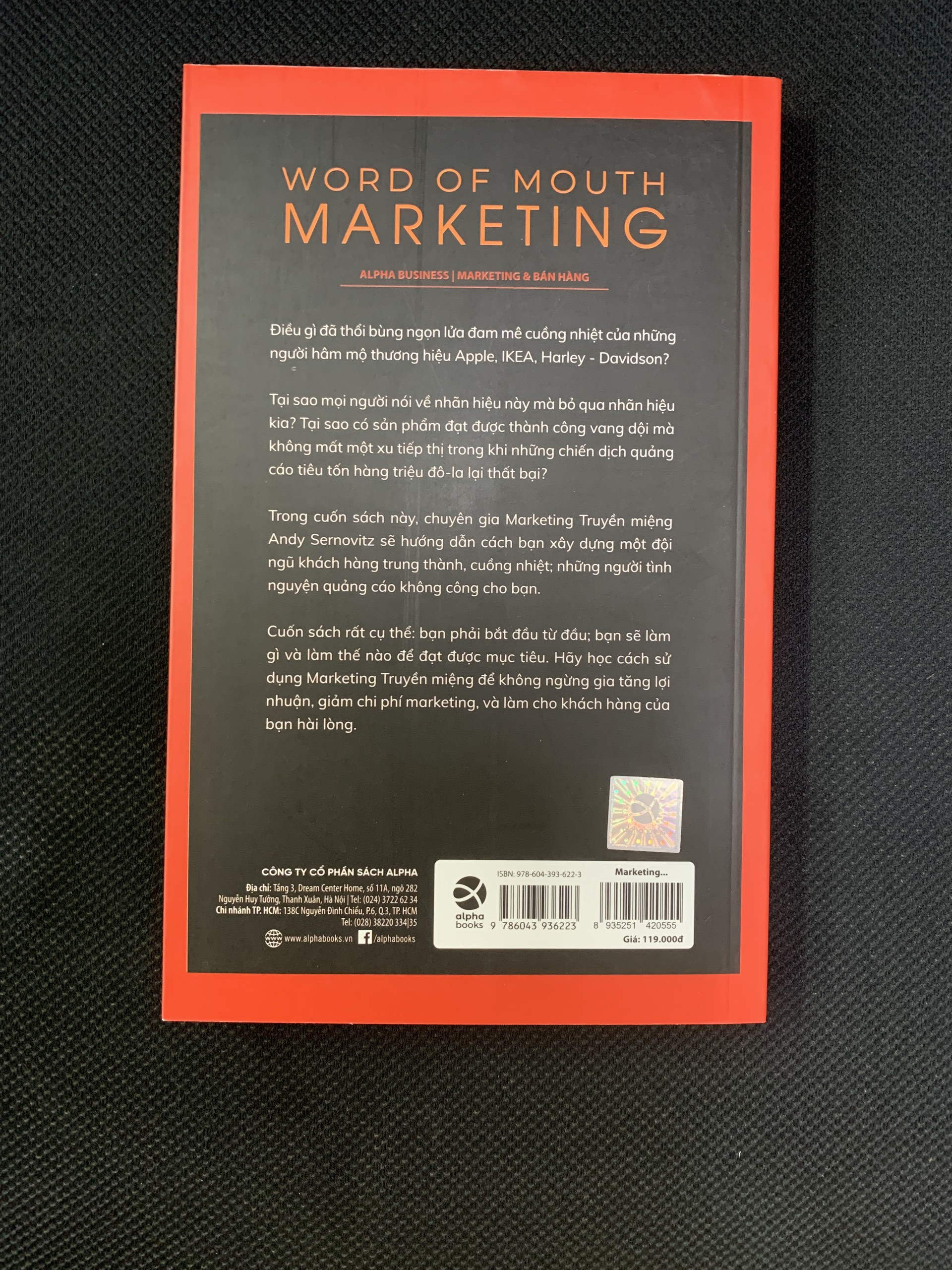 Và nếu, bạn cũng đang là một người quan tâm đến vấn đề này: “quảng cáo với chi phí thấp nhất nhưng lại đạt được hiệu quả lớn nhất” thì “Marketing truyền miệng” là quyển sách mà bạn không thể bỏ qua. Được viết bởi nhà marketing hàng đầu thế giới - Andy Sernovitz, quyển sách này giới thiệu đầy đủ mọi khía cạnh của marketing truyền miệng qua ba phần chính: “Tìm kiếm người nói – Đề tài ấn tượng – Công cụ truyền tải”. Không chỉ đưa ra những phần lý thuyết suông đấy sáo rỗng, quyển sách còn đưa ra cho bạn những bài tập ứng dụng làm sao để thực hiện công việc kinh doanh của công ty bạn và duy trì nó trong một thời gian dài, kèm theo đó là những ví dụ thực tế về những thành quả vượt trội mà các thương hiệu hàng đầu thế giới đã đạt được nhờ vào “Marketing truyền miệng”.