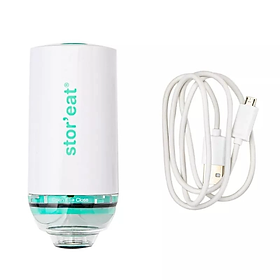 Máy hút chân không cầm tay màu trắng xanh nhỏ gọn, có dây sạc đi kèm. Máy hút giúp hút sạch không khí bên trong túi và giúp bảo quản thực phẩm trong ngăn đông được lâu hơn.