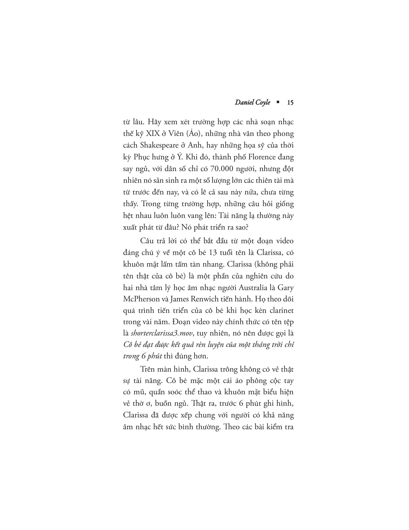 Dựa trên những thành tựu xuất sắc của ngành thần kinh học và nghiên cứu mới nhất trong quá trình đi tới 9 địa chỉ sản sinh ra rất nhiều tài năng của thế giới – từ sân bóng chày ở vùng Ca-ri-bê đến học viện âm nhạc cổ điển phía bắc New York – Coyle đã chỉ ra 3 yếu tố then chốt cho phép bạn phát triển tài năng và tối ưu hóa khả năng của m.ình trong các lĩnh vực thể thao, nghệ thuật, âm nhạc, toán học hay bất kỳ điều gì khác.