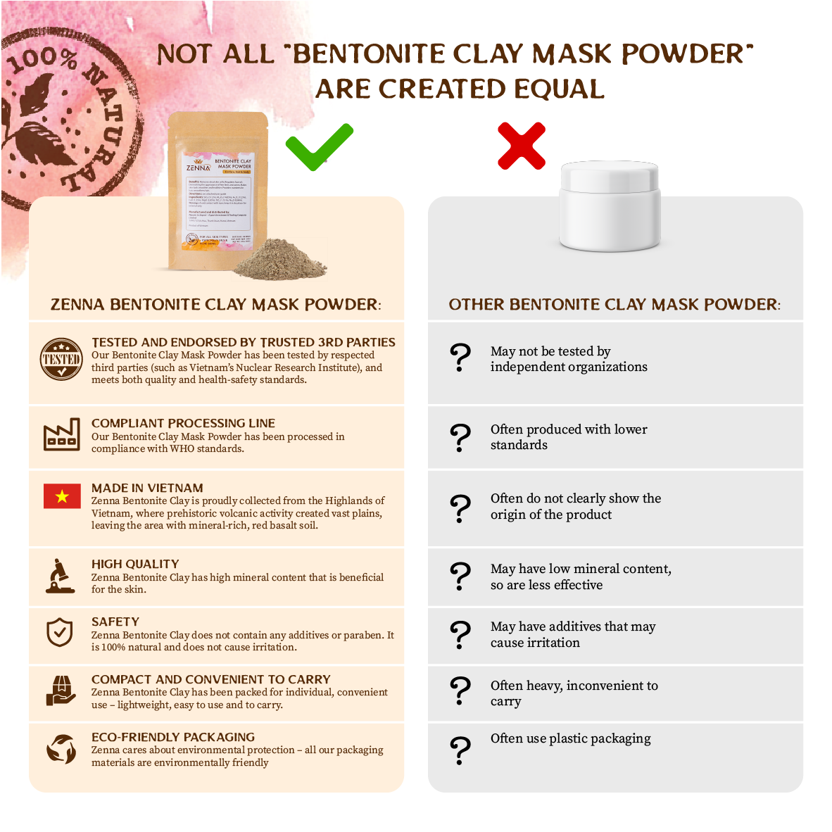 - Chất lượng sản phẩm đạt tiêu chuẩn quốc tế: Được khai thác từ vùng mỏ Bentonite Clay trầm tích, Mặt nạ bùn khoáng núi lửa ZENNA được tìm thấy chứa nhiều loại vi khoáng thiết yếu có lợi, giúp tái tạo hệ thống phòng vệ cho da, giúp da sạch, sáng và khỏe dần từ sâu bên trong. Để được lưu hành sản phẩm trên thị trường, bùn khoáng ZENNA đã trải qua các quá trình kiểm duyệt khắt khe về tiêu chuẩn chất lượng của Sở Y tế, được xử lý khai thác tại nhà máy chuẩn GMP và được đóng gói trong môi trường khép kín theo quy trình đạt chuẩn ASEAN. Bùn khoáng ZENNA được công nhận là sản phẩm đạt tiêu chuẩn về hàm lượng khoáng Bentonite kiềm, nguyên chất 100%. Trong Bentonite kiềm chứa các thành phần chủ yếu là Canxi, Magie, Natri, Silic… kèm một số khoáng chất vi lượng rất cần thiết cho cơ thể con người và không chứa thành phần độc hại nào. Hiện sản phẩm đã có mặt trên trang TMĐT lớn nhất - Amazon, đã sẵn sàng để mang sản phẩm Việt Nam chất lượng cao vươn ra toàn cầu.
