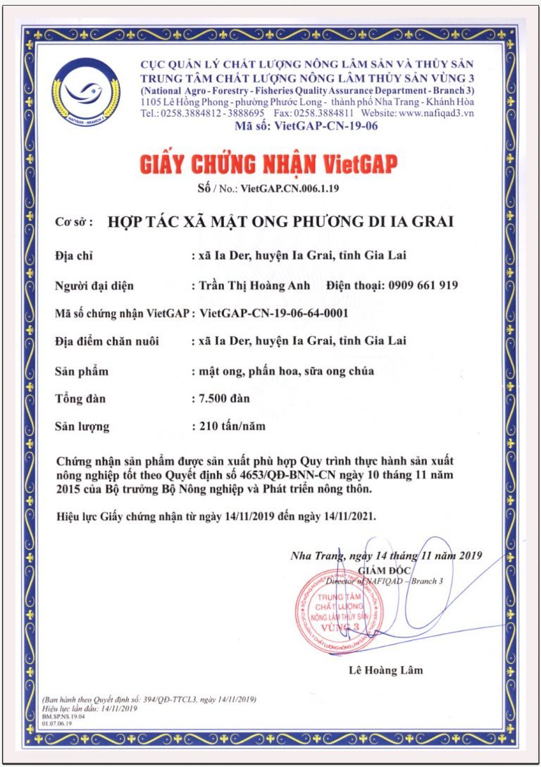 Mật ong hoa cà phê Phương Di, nuôi ong và khai thác mật theo tiêu chuẩn Vietgap: Mật ong tự nhiên 100%, Không chất bảo quản, không phụ gia, không hương liệu. Là sản phẩm đạt OCOP 4 sao duy nhất tỉnh Gia Lai 2019
