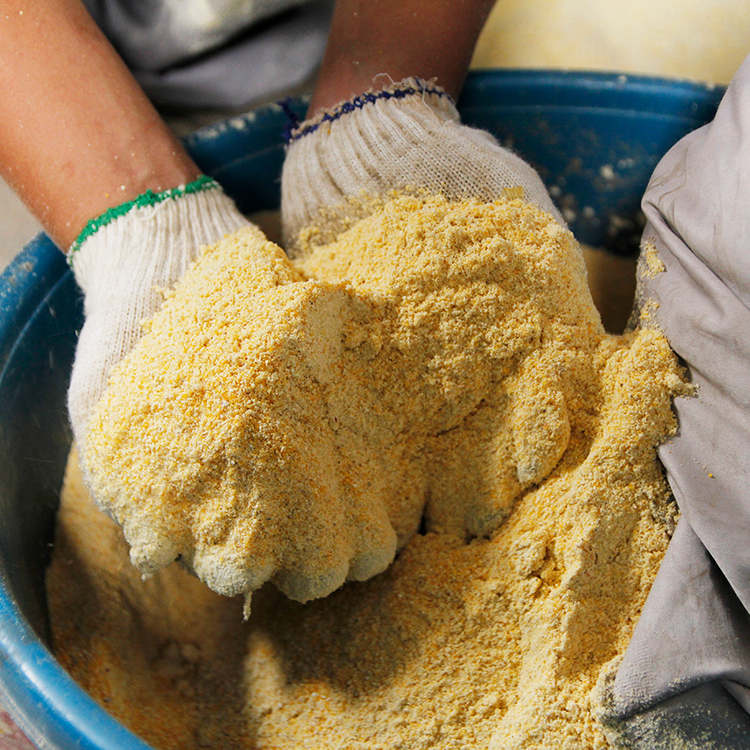 TÍNH NĂNG NGHIỀN BỘT KHÔ (đối với các loại nguyên liệu như): Hạt ngô, đậu tương, gạo, sắn củ (sắn lát) khô, các loại cá khô… từ dạng thô sang dạng tinh bột làm nguyên liệu để ủ men, ép cám viên, hoặc chế biến các dạng thức ăn khác cho vật nuôi. Năng suất nghiền bột khô của máy đạt 50 – 70Kg/giờ.