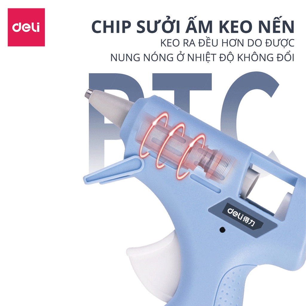 MÁY BẮN KEO    Máy bắn keo Deli có thiết kế màu xanh và màu hồng bát mắt với công suất 20W đủ để đáp ứng nhu cầu thi công lắp đặt hiệu quả và nhanh chóng với tốc độ làm nóng nhanh. máy được trang bị lõi nhiệt giúp dòng keo được nóng chảy ổn định. máy còn có cơ chế kiểm soát dòng chảy của keo, đặc biệt là sản phẩm có kiểu dáng nhỏ gọn, dễ dàng mang theo và sử dụng trong nhiều không gian, đáp ứng được nhiều nhu cầu sử dụng khác nhau. máy bắn keo này có tuổi thọ cao với đầu phun keo bằng đồng. Ngoài ra, dây điện cũng được kiểm định chất lượng giúp an toàn hơn cho người dùng.   THÔNG SỐ KỸ THUẬT: