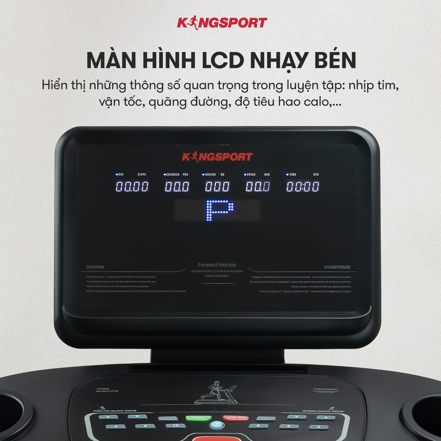 MÁY CHẠY BỘ KINGSPORT BK-8000 ĐA NĂNG - SỰ LỰA CHỌN TỐI ƯU CHO CẢ NHÀ CÙNG KHỎE ️ Thiết kế sang trọng và hiện đại phù hợp với mọi không gian ️ Khung sườn chắc chắn đảm bảo độ an toàn cao ️ Màn hình LCD hiển thị các thông số đo thời gian, quãng đường, vận tốc và calories ️ Thảm chạy Diamond nhiều lớp chống ồn và trơn trượt, rộng rãi lên đến 1260x420 mm ️ 12 chương trình luyện tập đa dạng để lựa chọn ️ Sở hữu tay cầm được tích hợp chương trình cảm biến nhịp tim ️ Tích hợp tính năng tra dầu tự động giúp máy vận hành tốt hơn ️ Động cơ mạnh mẽ và vượt trội với khả năng chạy tốc độ cao lên đến 14km/h ️ Trang bị thanh gập bụng và đai massage giúp tối ưu hiệu quả tập luyện ️ Bàn phím cơ siêu bền dễ dàng sử dụng ️ Hệ thống giảm sốc thông minh giúp giảm chấn thương trong quá trình tập ️ Nghe nhạc giải trí với âm thanh sống động: jack 3.5 và Bluetooth THÔNG SỐ KỸ THUẬT -