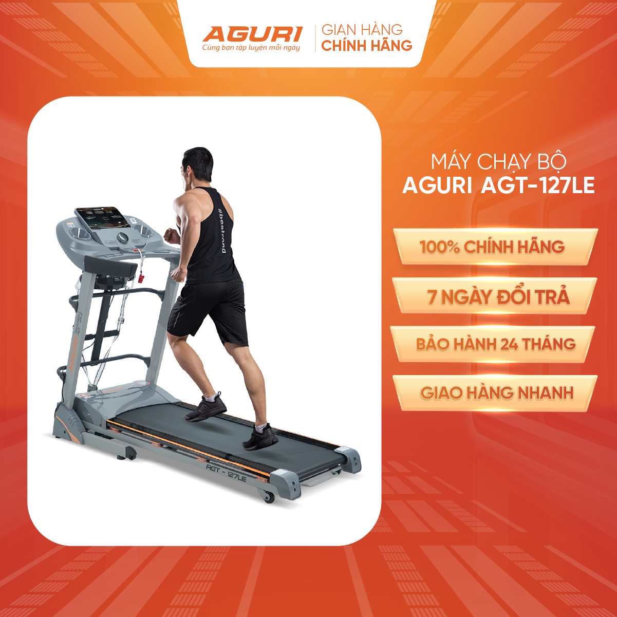 Máy chạy bộ AGURI AGT-127LE - máy chạy bộ tại nhà Đây là máy chạy bộ chính hãng của thương hiệu AGURI - Máy tập của Cầu thủ Công Phượng. Là mẫu máy chạy bộ giá tốt được nhiều người tiêu dùng lựa chọn. Một mẫu máy chạy bộ gấp gọn dễ dàng, tiết kiệm không gian cho người dùng. > THÔNG SỐ KỸ THUẬT:  - Motor DC công suất 3.5HP - Tốc độ: 1.0km/h – 16km/h - Chương trình mặc định: P1-P24 - Kích thước đặt máy (dài-rộng-cao): 1760*720*1320mm - Kích thước đóng thùng: 1780*760*325mm - Diện tích băng tải: 450*1350mm - Trọng lượng người dùng tối đa: 130 kgs - N.W/G.W: 80/90kg     > MÔ TẢ SẢN PHẨM: - Màn hình LED 5 cửa số hiển thị: thời gian, quãng đường, vận tốc, nhịp tim, calories, chương trình mặc định - Máy có piston thủy lực nâng đỡ, có thể gập gọn máy khi không sử dụng, bàn chạy có tay cầm để dễ dàng nhấc bàn chạy lên - Máy có bánh xe di chuyển rất dễ dàng - Máy được trang bị 1 đầu massage, đánh mỡ bụng ; bộ phận gập bụng - Có hệ thống giảm sóc khi hoạt động, kết nối Bluetooth, hệ thống 2 loa stereo - Có chức năng đo chỉ số cơ thể (Body fat)    > CHÍNH SÁCH BẢO HÀNH, BẢO TRÌ: - Bảo hành chi tiết máy lên tới 5 năm. Cụ thể: