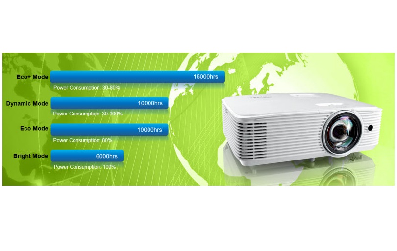 Chế độ ECO+ được tinh chỉnh đặc biệt trên Optoma X309ST, cho phép người dùng giảm tiêu thụ điện năng lên đến 70% và kéo dài tuổi thọ bóng đèn lên đến 15.000 giờ. Loa tích hợp 10W trên máy chiếu cung cấp âm thanh rõ ràng và thuận tiện cho việc thiết lập mà không cần sử dụng loa ngoài.