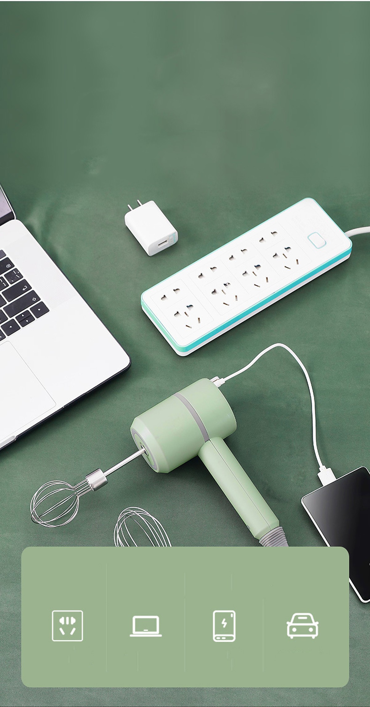 Đây là chiếc máy đánh trứng tuyệt vời cho các mẹ. Là dạng máy cầm tay, nên các mẹ có thể đánh trứng ở bất kỳ đâu: trong chén to, trong ly/cốc, trong nồ đều được. Máy đi kèm với 2 thanh đánh trứng nhiều cạnh, và 2 que xoắn để nhào bột hoặc trộn salad. Que trộn làm từ inox, có thể tháo rời được, dùng xong chỉ cần tháo ra vệ sinh que trộn là xong.