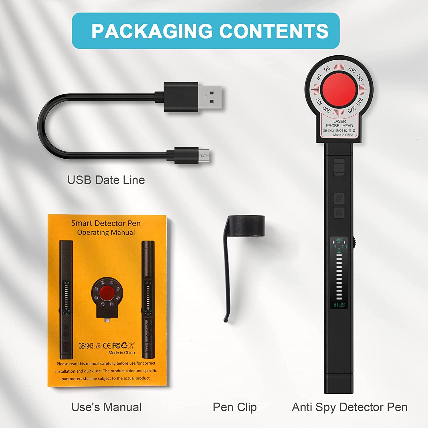 Mô Tả sản phẩm: Tên sản phẩm: Chất liệu: ABS Kích thước: 102x52x21mm Công suất: 3.7V/300mA pin lithium Phạm Vi phát hiện: 1MHZ-6000MHZ Phát Hiện hồng ngoại Tầm Xa: 10cm đến 15m Tính Năng sản