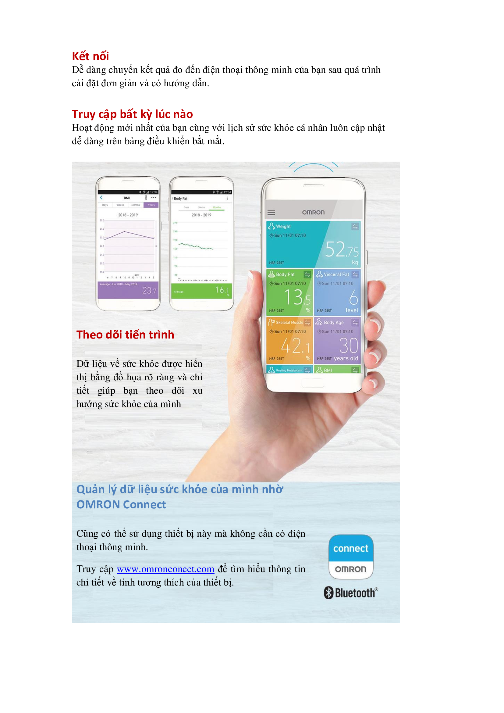 MÁY ĐO THÀNH PHẦN CƠ THỂ OMRON HBF-255T - PHÂN TÍCH TỶ LỆ % MỠ DƯỚI DA VÀ CƠ XƯƠNG - KẾT NỐI ĐIỆN THOẠI - THƯƠNG HIỆU NHẬT BẢN    TÍNH NĂNG SẢN PHẨM Chức năng trừ trọng lượng: hiển thị sự chênh lệch trọng lượng cơ thể ở lần 1 và lần 2. Thuận tiện để đo trọng lượng của em bé hoặc thú cưng.  Kết nối Bluetooth với ứng dụng Omron connect giúp bạn dễ dàng lưu trữ, theo dõi và quản lý dữ liệu sức khỏe. Chỉ số khối cơ thể (BMI)    Cơ xương      Mỡ cơ thể     Phân tích mỡ nội tạng Tuổi cơ thể: tính toán cơ thể bạn bao nhiêu tuổi về mặt sinh học dựa trên sức khỏe cũng như mức độ thể chất của bạn. Năng lượng chuyển hóa khi nghỉ: tìm hiểu sâu hơn về tốc độ đốt cháy năng lượng của cơ thể khi ở trạng thái nghỉ ngơi.   Hiển thị kết quả đo cuối cùng: giúp bạn theo dõi tiến trình của mình chính xác Bộ nhớ 4 người dùng + 1 khách với tính năng tự động nhận dạng cho người dùng Đo trọng lượng cơ thể lên đến 135kg                        THÔNG TIN THƯƠNG HIỆU   Tập đoàn Omron được thành lập năm 1933, với trụ sở chính đặt tại Kyoto, Nhật Bản. Mở rộng và hoạt động ở Châu Á, Châu Mỹ, Châu Úc và Châu Âu. Với công nghệ “cảm biến thông tin sinh học” đảm bảo độ chính xác cao trong các thiết bị kiểm tra sức khỏe,  Tất cả các loại máy đo huyết áp, nhiệt kế điện tử OMRON đã được Hiệp hội y tế Hoa Kỳ, Hiệp hội tăng huyết áp Anh, Hiệp hội tăng huyết áp Châu Âu chứng nhận lâm sàng về độ chính xác và an toàn khi sử dụng.