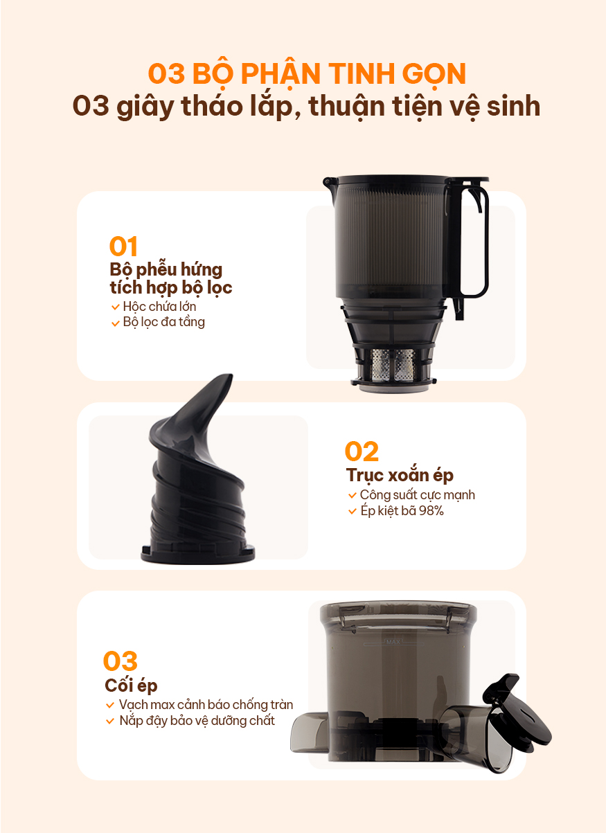 • Tinh gọn thiết kế 3 bộ phận tháo rời, chỉ cần 3 giây để lắp đặt và dễ dàng vệ sinh chi tiết máy.