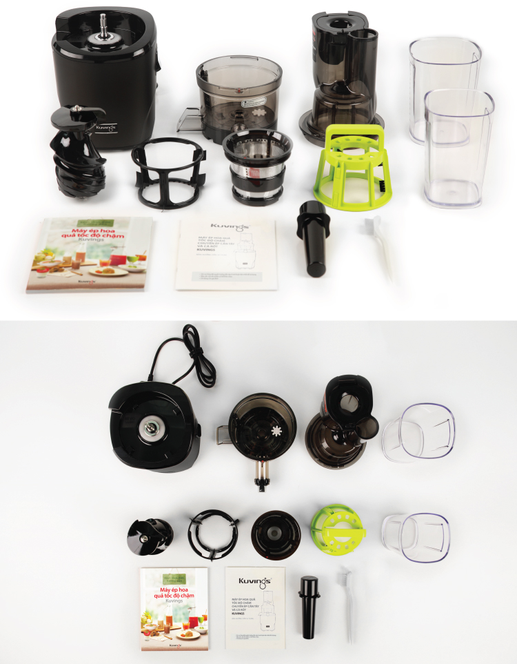 Có sách hướng dẫn công thức làm các loại Nước ép, Soup, Mojito, Cocktails, Sinh tố và Kem hoa quả, dụng cụ vệ sinh (chổi xoay và bàn chải), ca đựng nước ép và ca đựng bã ép kèm theo sản phẩm