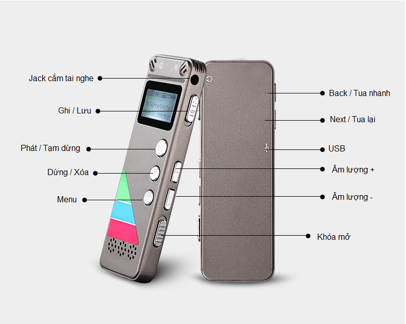 Chất liệu vỏ: Hợp kim kẽm Màn hình: Màn hình màu TFT 1,44 inch Định dạng ghi âm và tốc độ lấy mẫu: Định dạng WAV (32Kbps-1536Kbps) Chất lượng ghi âm: WAV 512Kbps (mặc định)