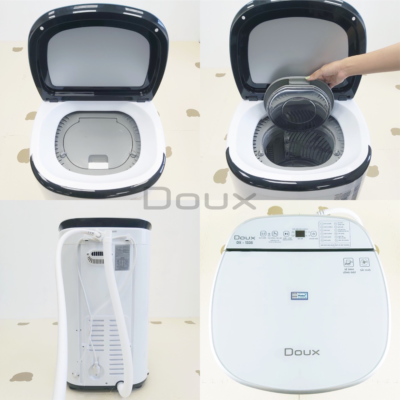 - Kích thước: 464373,5cm. -Màu sắc: trắng, hồng Độ bền cao, tuổi thọ máy giặt mini lớn với 1 NĂM BẢO HÀNH chính hãng tại Việt Nam. MÁY GIẶT MINI DOUX LUX RA MẮT BẢN NÂNG CẤP 2023 CÓ CHỨC NĂNG SẤY DOUX DX-1335(không có ánh sáng xanh nhưng có sấy diệt khuẩn)