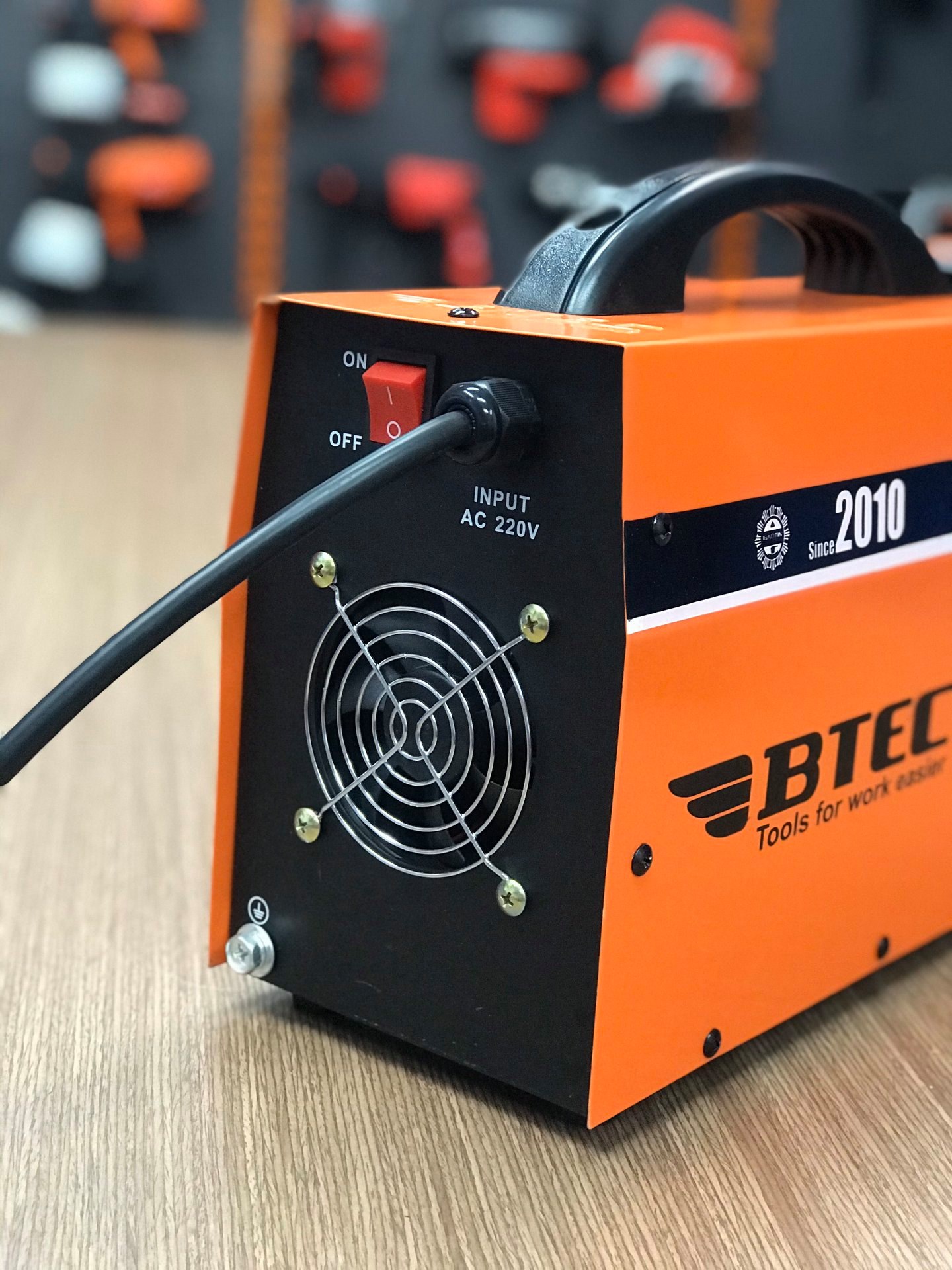 Mặt sau của máy hàn điện tử BTEC MMA-200 (xác lớn) ta thấy: Công tắc (ON OFF), Dây điện áp đầu vào, Quạt gió ( giúp tản nhiệt), đầu tiếp nối đất