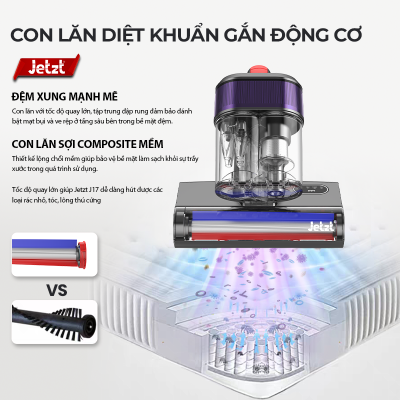 Để đảm bảo sức khỏe an toàn cho mọi thành viên trong gia đình bạn chắc chắn không thể bỏ qua sản phẩm MÁY HÚT BỤI GIƯỜNG NỆM JETZT J17 với 7 tầng lọc bụi, mang lại khả năng tiêu diệt bụi bẩn, vi khuẩn bám trên giường đệm sạch tới 99%. Với công nghệ diệt khuẩn bằng tia UV, những vết bẩn, vi khuẩn bám lâu ngày sẽ biến mất một cách dễ dàng khi sử dụng JETZT J17.