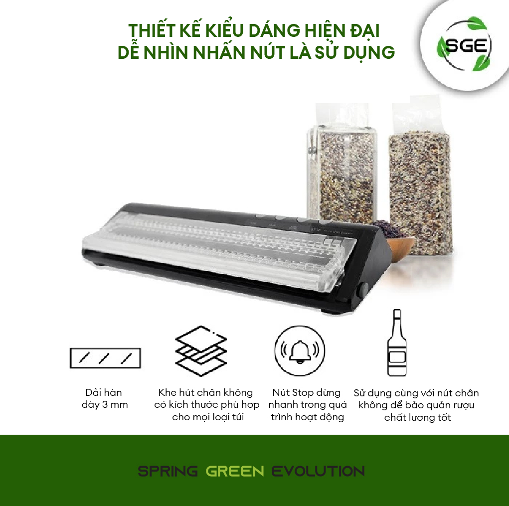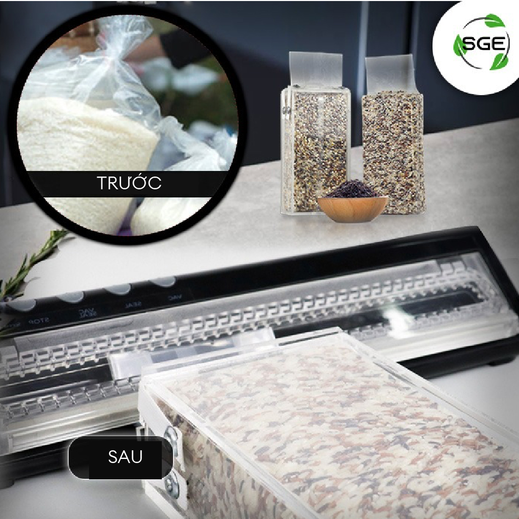 - Được làm bằng vật liệu EVA chất lượng tốt, chắc chắn. MÁY HÚT CHÂN KHÔNG CẦM TAY GIA ĐÌNH VCX Máy hút chân không gia đình VCX – đỉnh cao công nghệ bảo quản thực phẩm. Máy có chức năng loại bỏ không khí khỏi bao bì thực phẩm, làm cho một số vi sinh vật trong thực phẩm ngừng phát triển (thực phẩm sẽ bị hư hỏng chậm hơn) và giảm không gian lưu trữ cũng như kiểm soát mùi hôi. Có thể kéo dài tuổi thọ sản phẩm lâu hơn. Ngoài việc được sử dụng rộng rãi trong ngành công nghiệp thực phẩm, máy hút chân không cfon được sử dụng trong ngành công nghiệp phụ tùng, thiết bị điện tử (để chống gỉ hoặc mòn do tiếp xúc với không khí) VIDEO GIỚI THIỆU SẢN PHẨM MÁY HÚT CHÂN KHÔNG MINI VCX VIDEO GIỚI THIỆU SẢN PHẨM MÁY HÚT CHÂN KHÔNG MINI VCX Máy hàn hút chân không VCX được thiết kế mạnh mẽ hơn nhưng vẫn giữ được sự đơn giản để có thể di chuyển dễ dàng. Máy có thể hoạt động liên tục nhiều giờ hơn so với dòng máy nhỏ. Thiết kế dễ sử dụng, mặt trước trong suốt để người dùng có thể sắp xếp miệng túi cho đẹp và dễ làm việc hơn. Đặc biệt máy được trang bị nút dừng khẩn cấp khi đang sử dụng. Các tính năng bổ sung của máy hút chân không VCX Máy không có hệ thống lưỡi hút nên chỉ sử dụng được với túi mặt nhám. Tuy nhiên dòng máy này có thể đóng gói cả đồ khô và đồ ướt cũng như có thể hàn miệng túi mà không cần hút chân không. Máy còn có thể được dùng để đóng gói túi gạo acrylic chắc chắn và đẹp mắt. KÍCH THƯỚC THỰC TẾ THÔNG SỐ KỸ THUẬT MÁY HÚT CHÂN KHÔNG MINI VCX Máy hút chân không mini VCX được thiết kế mạnh mẽ hơn nhưng vẫn giữ được sự đơn giản và tiện dụng. Ngoài ra, nắp máy ở mặt trước trong suốt cho phép người dùng có thể quan sát khi xếp miệng túi, giúp đóng gói bao bì đẹp mắt hơn. Do máy hút chân không mini không dùng hệ thống lưỡi hút nên chỉ có thể được sử dụng được với túi hút chân không một mặt nhám. Tuy nhiên, máy lại có thể hút chân không đối với cả sản phẩm khô và ướt. Hơn nữa, máy còn có thể hàn miệng túi riêng biệt mà không cần phải hút chân không. Đặc biệt, máy sử dụng được với cả hộp Acrylic đóng gói gạo để tạo ra các bao bì rất thẩm mỹ. Xem thêm về bao bì . Ngoài ra, nếu nhu cầu bảo quản thực phẩm lớn hơn và thường xuyên hơn, xin giới thiệu sản phẩm . THÔNG SỐ KỸ THUẬT MÁY HÚT CHÂN KHÔNG MINI VCX ĐẶC ĐIỂM NỔI BẬT MÁY HÚT CHÂN KHÔNG VCX Máy hút chân không có thể đóng gói tất cả các loại thực phẩm, kéo dài tuổi thọ gấp 10 lần Máy đóng gói hút chân không chất lượng cao, giá cả phải chăng, có thể đóng gói túi gạo một cách hoàn hảo. Nắp acrylic dày trong suốt, dễ dàng sắp xếp túi. Có thể được sử dụng cùng với nút chân không để bảo quản rượu chất lượng tốt Dùng với bình hút chân không để tiết kiệm và có thể tái sử dụng. Các nút chức năng có thể điều chỉnh cho phù hợp theo nhu cầu. Khóa nắp chắc chắn để quá trình hàn tốt và nhanh hơn Khe hút chân không có kích thước phù hợp cho mọi loại túi MÁY HÚT CHÂN KHÔNG SGE TỐT NHƯ NÀO?