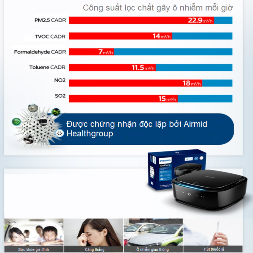 Máy lọc không khí ô tô Philips hút mùi hôi, chất gây ô nhiễm bao gồm vi khuẩn, vi rút GoPure GP5301 đèn báo 3 chế độ Công nghệ lọc Philips SelectFilter Plus làm sạch